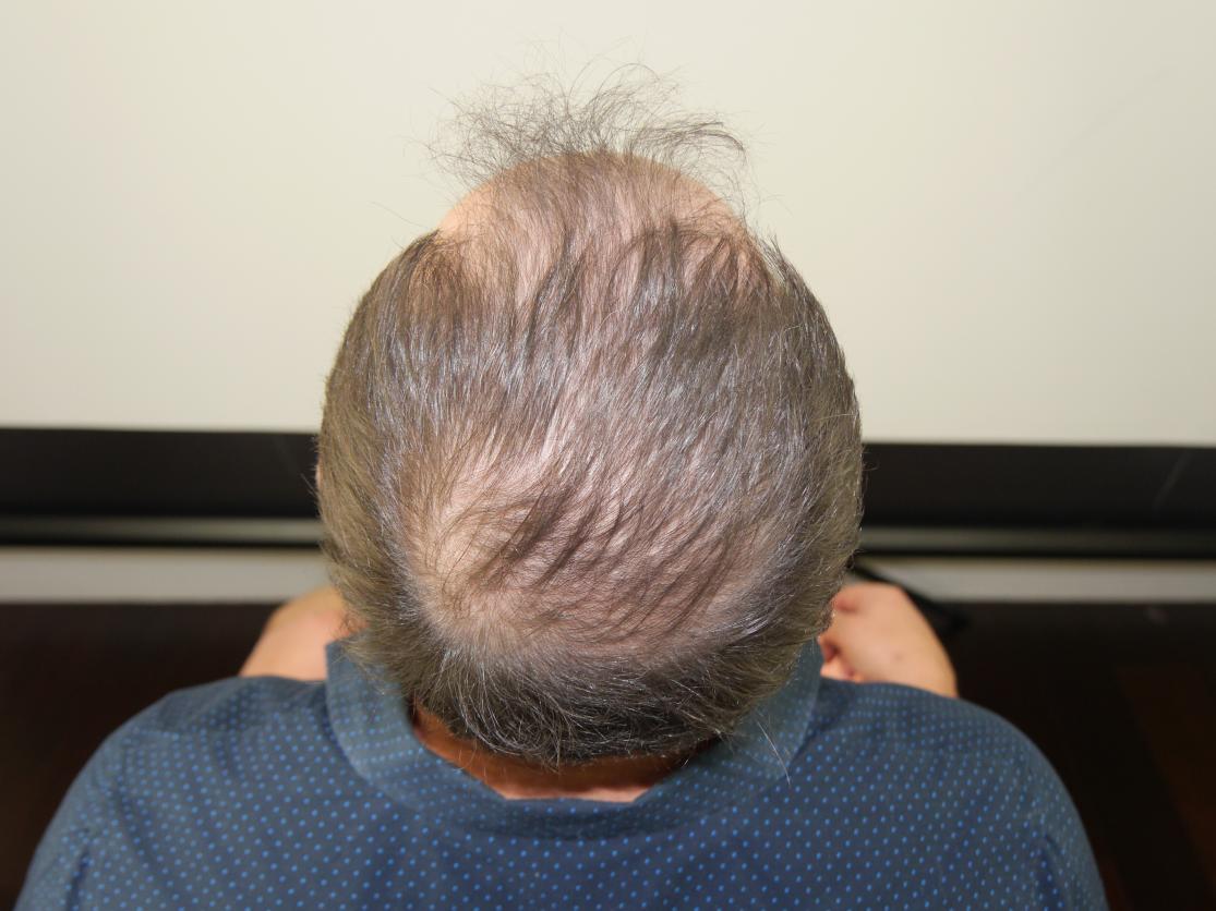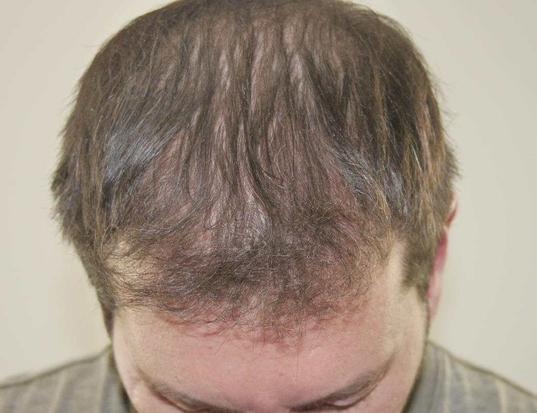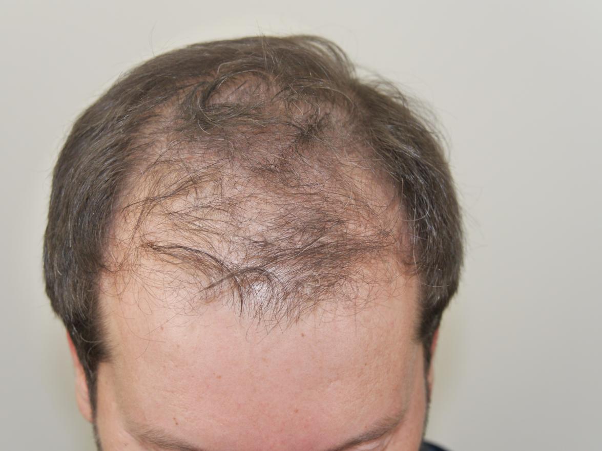 This 46-year-old male had a 2555 grafts FUT placed in frontal area in a single session. Photos show before and 8 months post-op. Patient is very pleased with results.