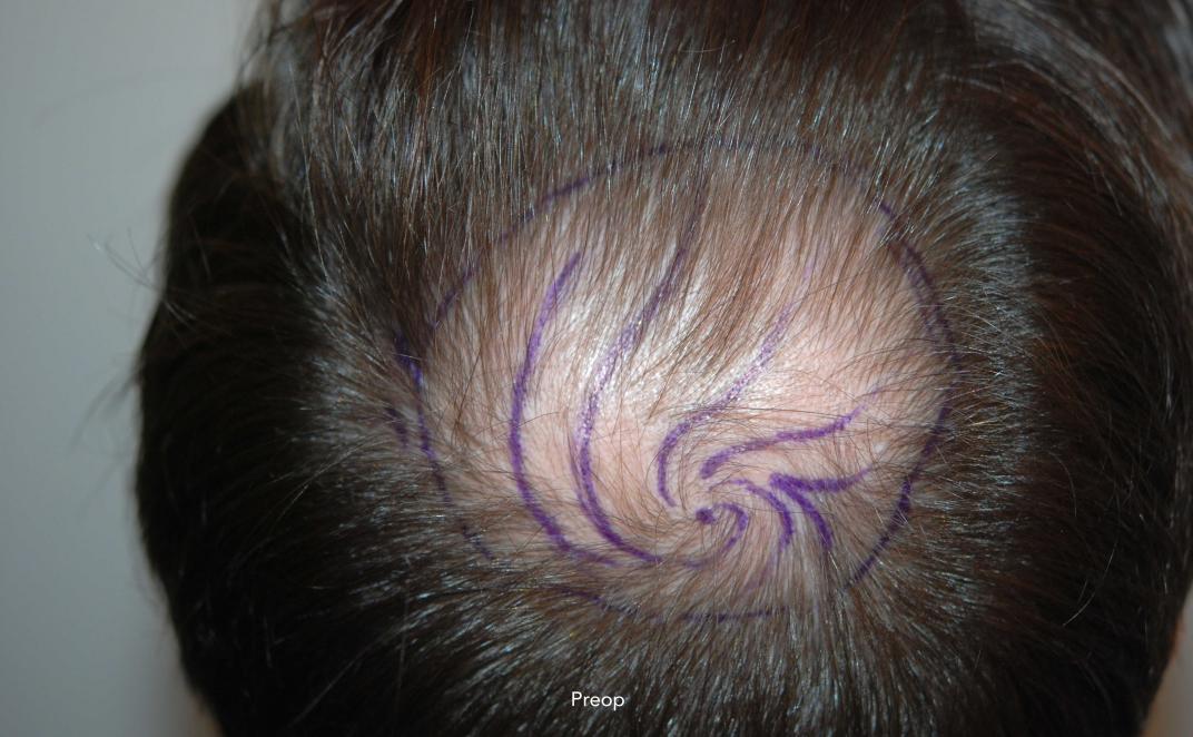 Follicular Unit Extraction to reconstruct the crown area and attain an aesthetic reconstruction of the hairline.