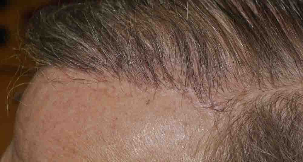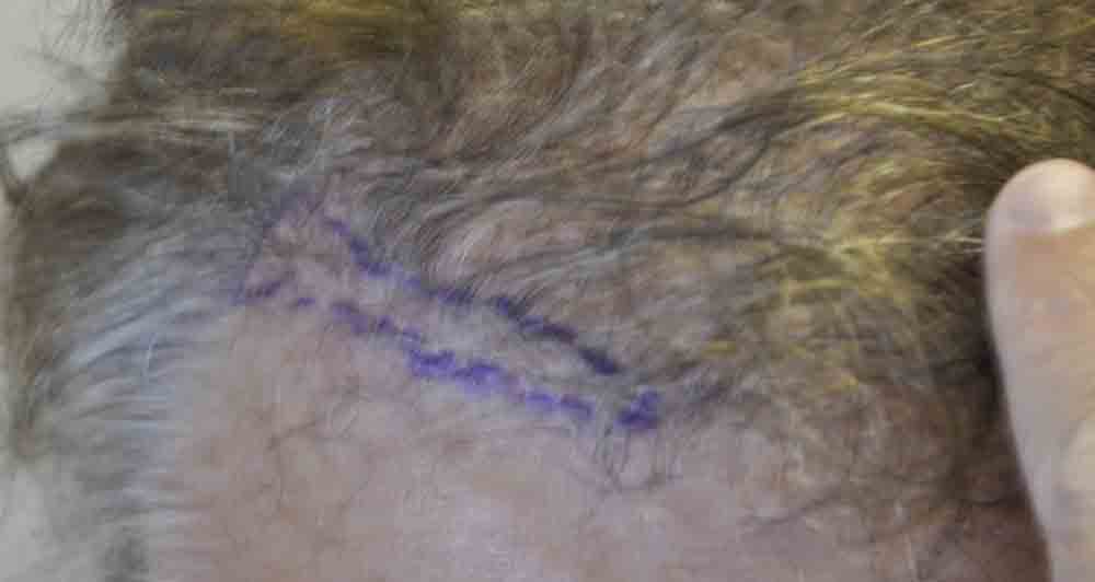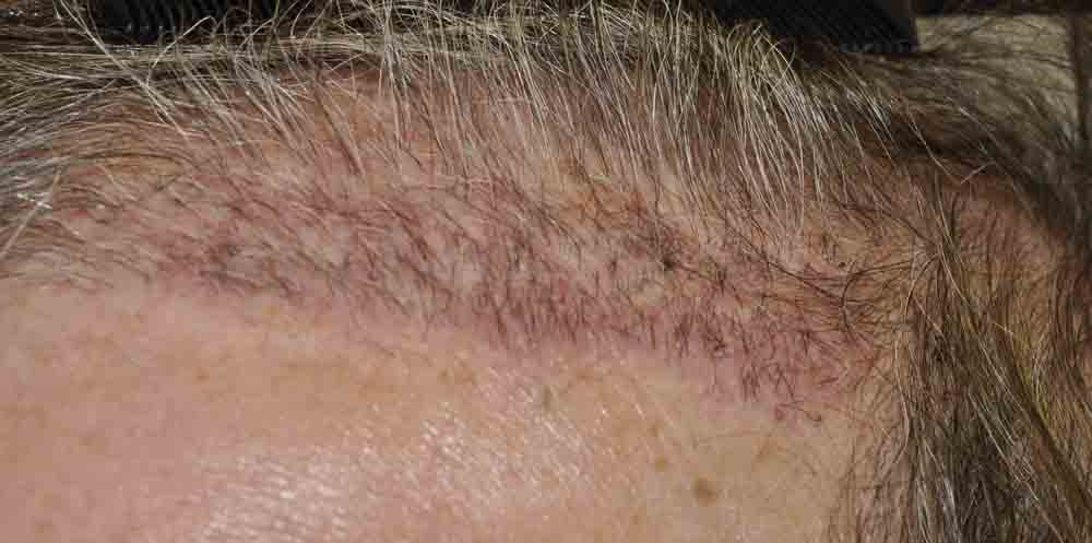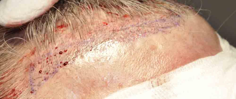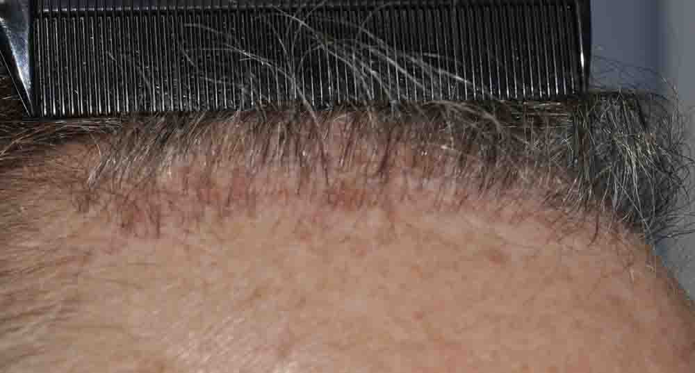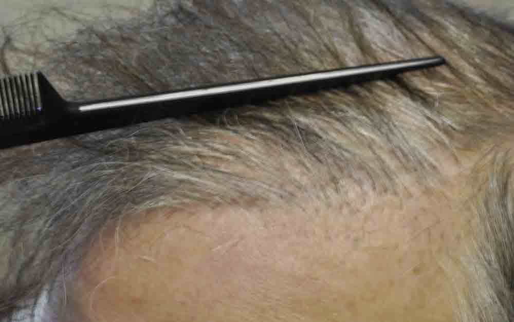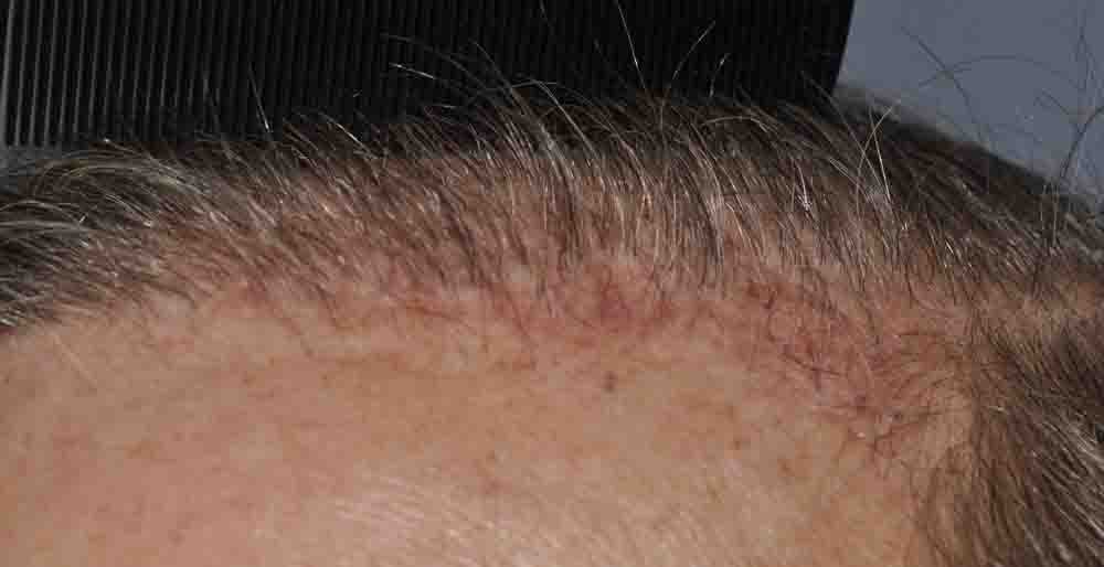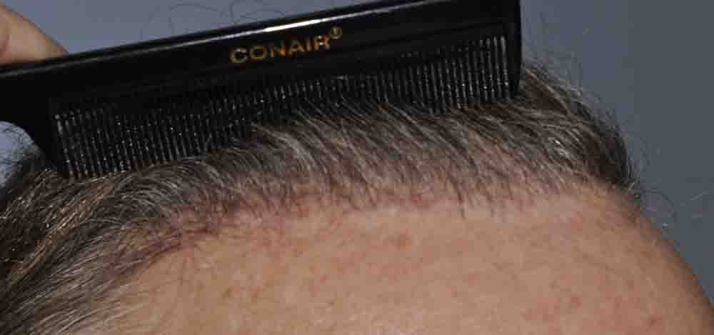 This physician colleague had had a couple of plug procedures, then a couple of minigraft procedures in the past by east coast and DC area docs. He and I became aquainted a few years ago when a few mutual patients introduced us. Around mid September, he came in and we excised a strip from his plugged out donor area (see pics) and we then packed and irregularized his previously straight and pluggy and sparse hairline. At his request I believe around 300 doubles and triples were also placed in a thin area about an inch and a half back behind his hairline.