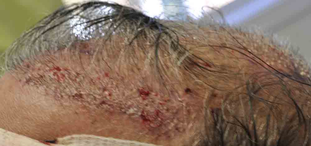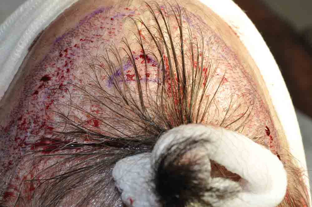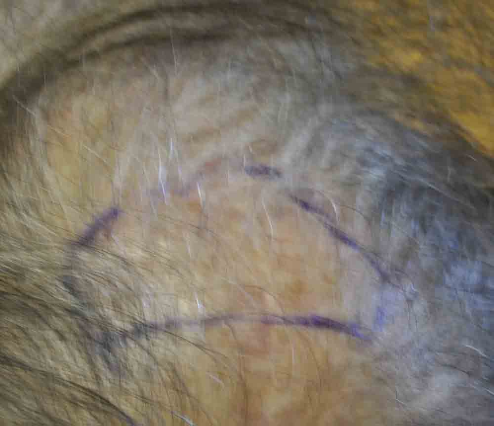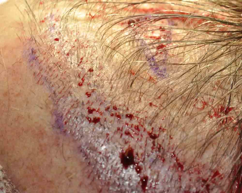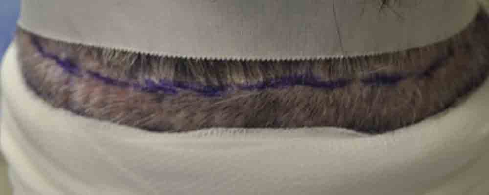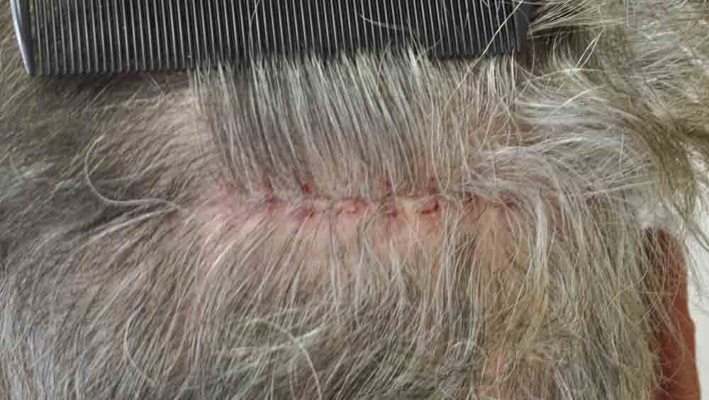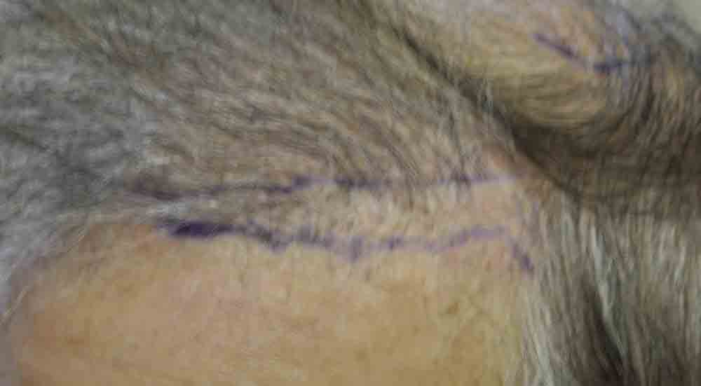 This physician colleague had had a couple of plug procedures, then a couple of minigraft procedures in the past by east coast and DC area docs. He and I became aquainted a few years ago when a few mutual patients introduced us. Around mid September, he came in and we excised a strip from his plugged out donor area (see pics) and we then packed and irregularized his previously straight and pluggy and sparse hairline. At his request I believe around 300 doubles and triples were also placed in a thin area about an inch and a half back behind his hairline.
