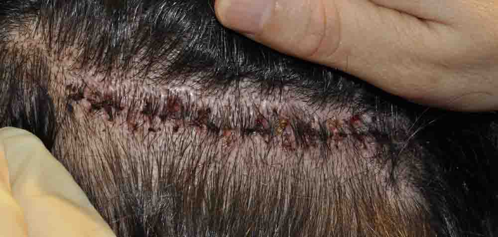 He had gone to a big chain hair operation several years back and got 2000 grafts with little to show for it except a pretty big scar. We did a large case for him and got great results last year. In that case-story I explained how we took our strip up to but not including is old scar, which was a pretty bad scar to begin with, as the patient wanted the most hair we could do, and felt he'd come back later for the scar.