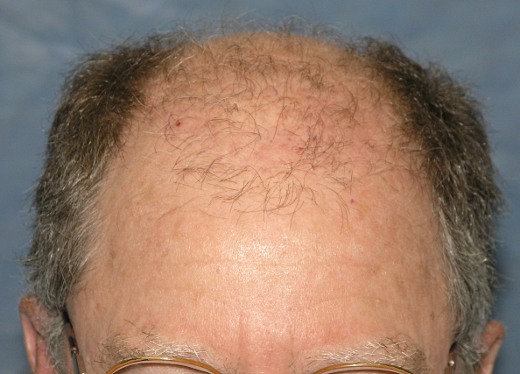 Note the large grafts in the first photo. These were removed, divided up under the microscope and re-implanted as individual follicular unit grafts. The second photo shows the patient after this procedure has healed and just prior to the first actual hair restoration.