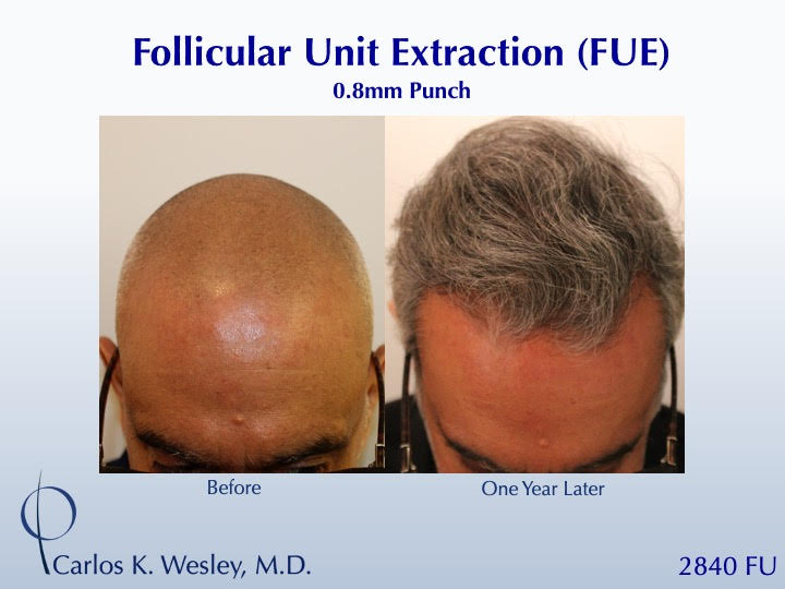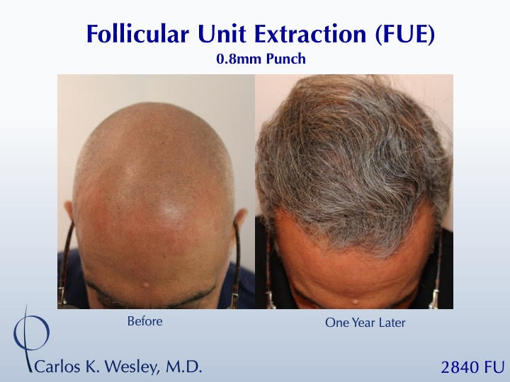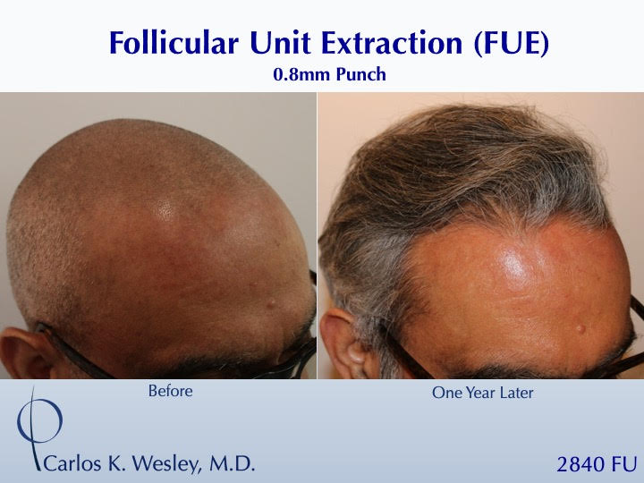 This 61-year-old man underwent a follicular unit extraction (FUE) session with Dr. Carlos K. Wesley in which a total of 2840 grafts were placed