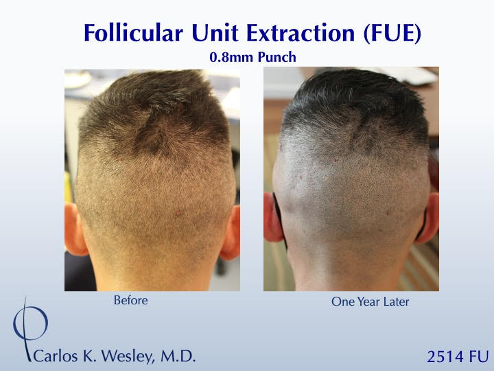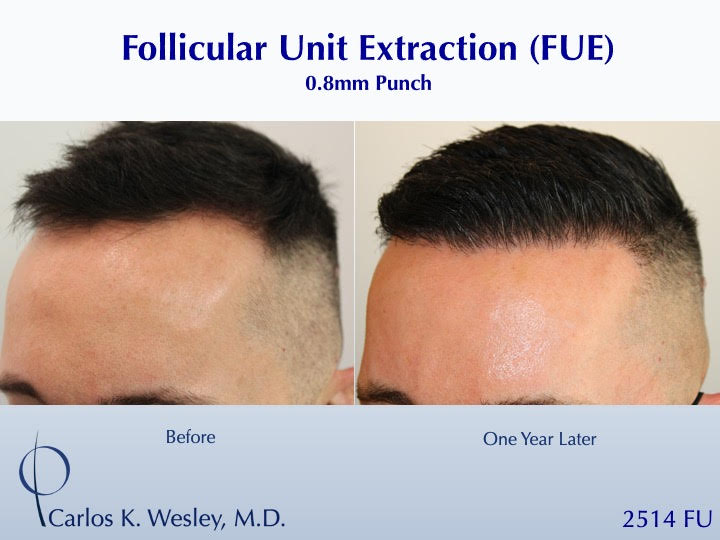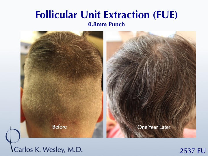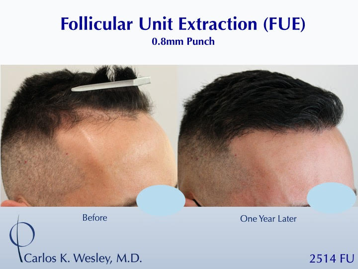 This 42-year-old man underwent a follicular unit extraction (FUE) session with Dr. Carlos K. Wesley in which a total of 2514 grafts were placed. Another patient shown after 2537 FUE grafts harvested.