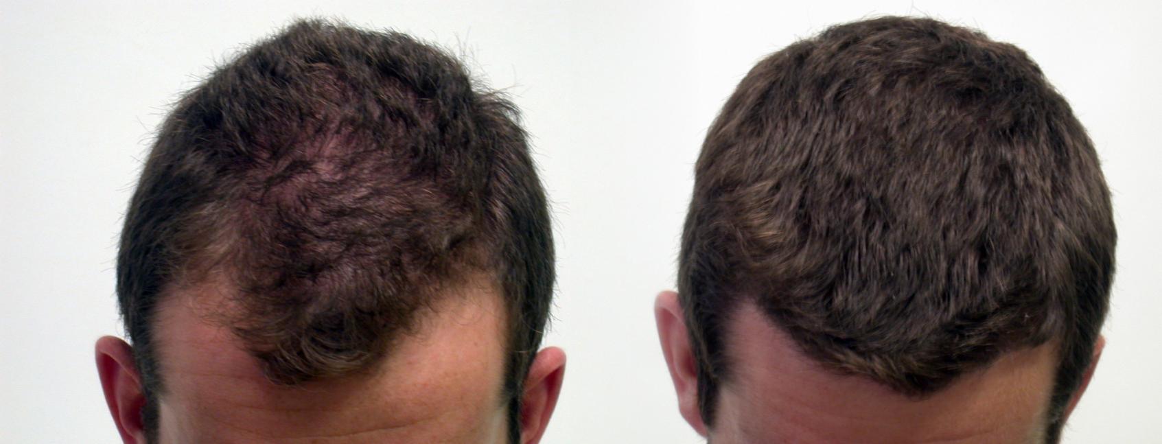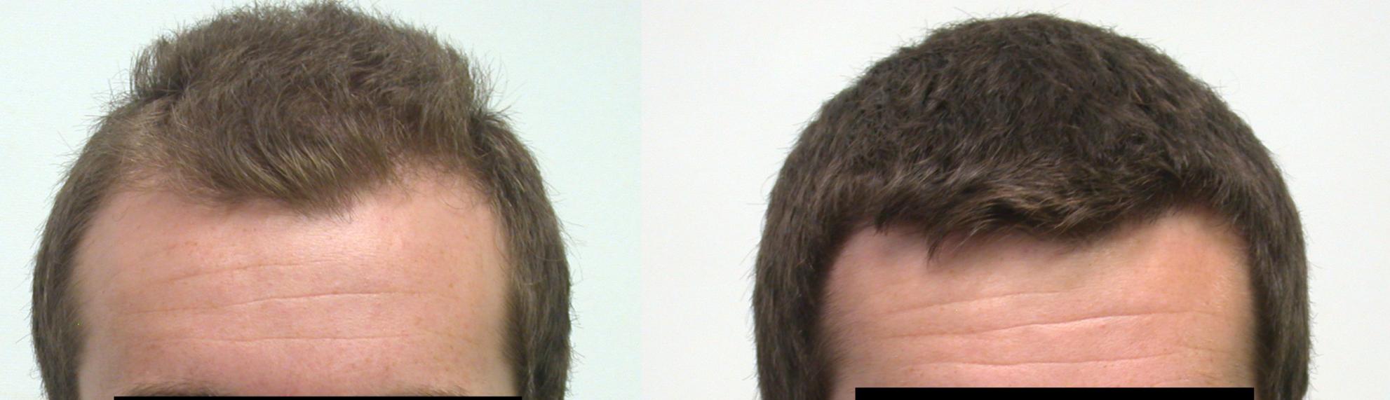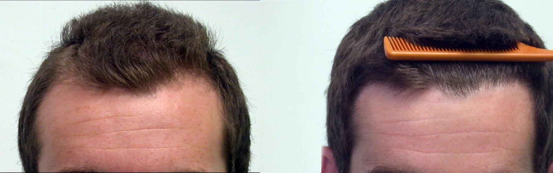 This young man came to Dr. Keene to add density to the central area, and fill in his temporal recession. The high contrast between his dark hair and light skin required higher density to avoid seeing through the hair to the scalp. He was taking Finasteride prior to the surgery for over a year. We placed 1724 grafts, averaging about 35 grafts per square cm. Here is the graft break down: