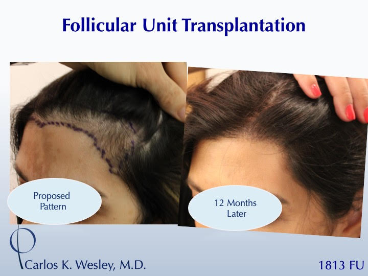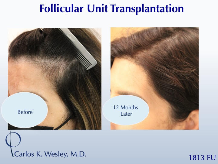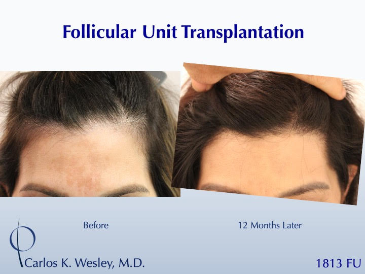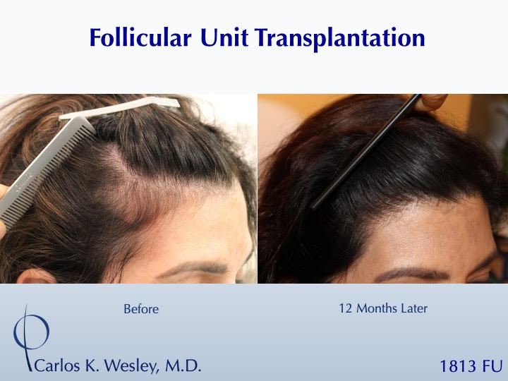 The patient returned 12 months after her procedure and images of the patient can be seen below. This link illustrates the timing of hair growth after surgery. Similar patient hair transformations with Dr. Wesley and his team may also be viewed.