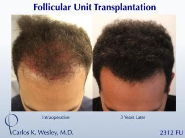 The patient returned three years after his procedure and images of the patient can be seen below. This link illustrates the timing of hair growth after surgery. Similar patient hair transformations with Dr. Wesley and his team may also be viewed.