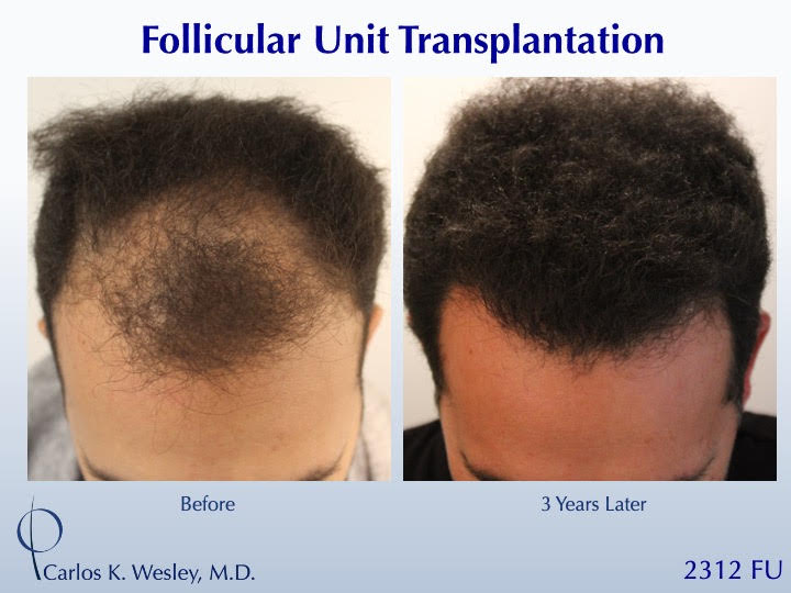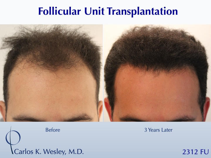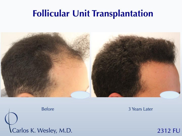 The patient returned three years after his procedure and images of the patient can be seen below. This link illustrates the timing of hair growth after surgery. Similar patient hair transformations with Dr. Wesley and his team may also be viewed.