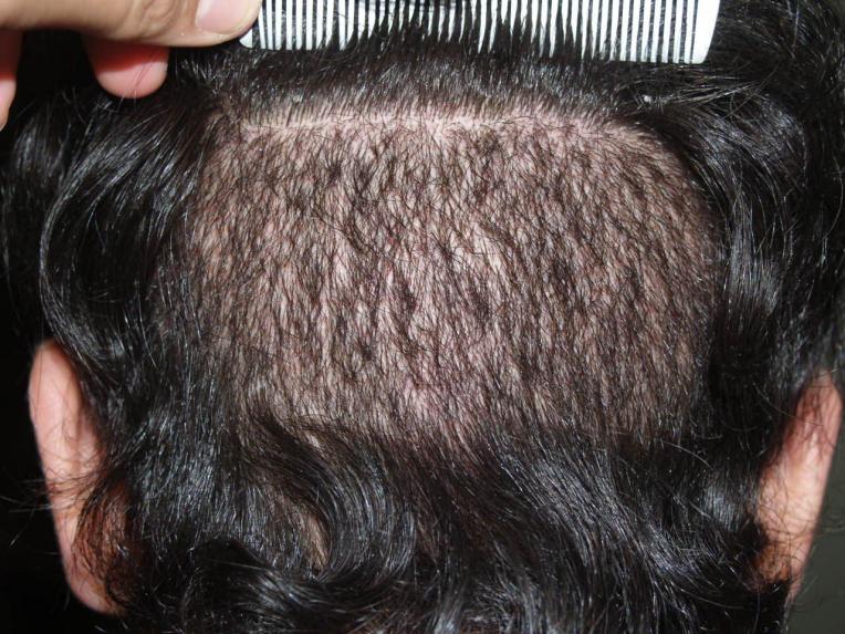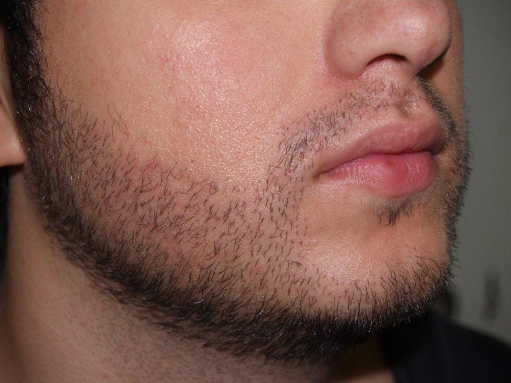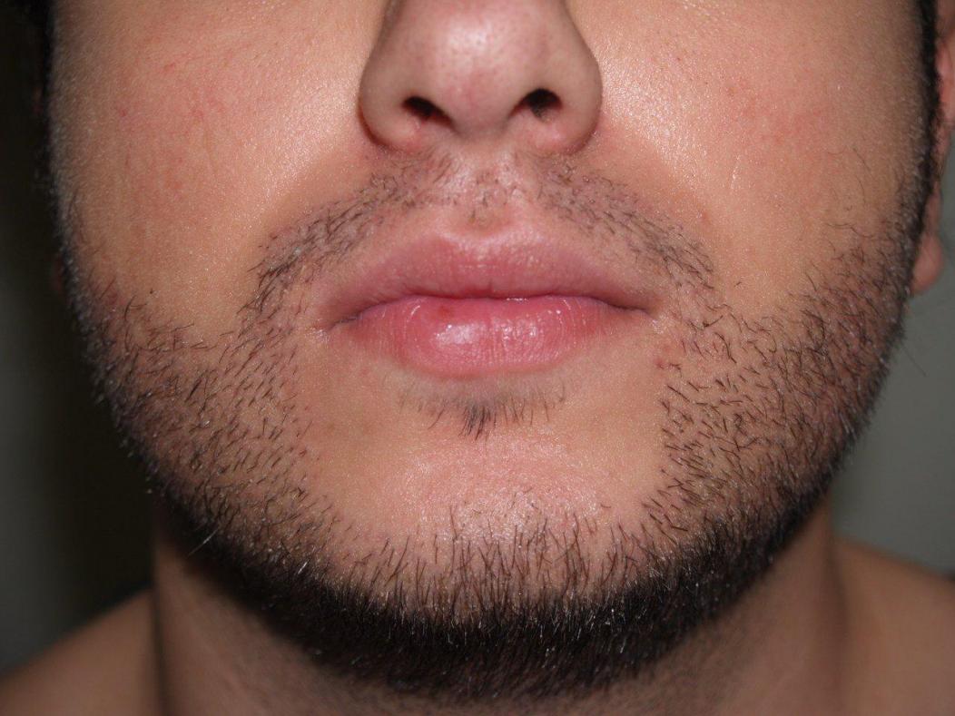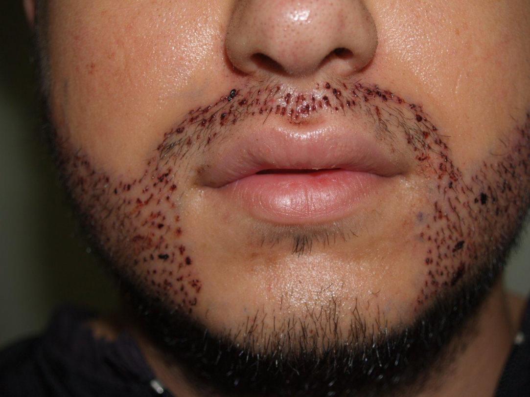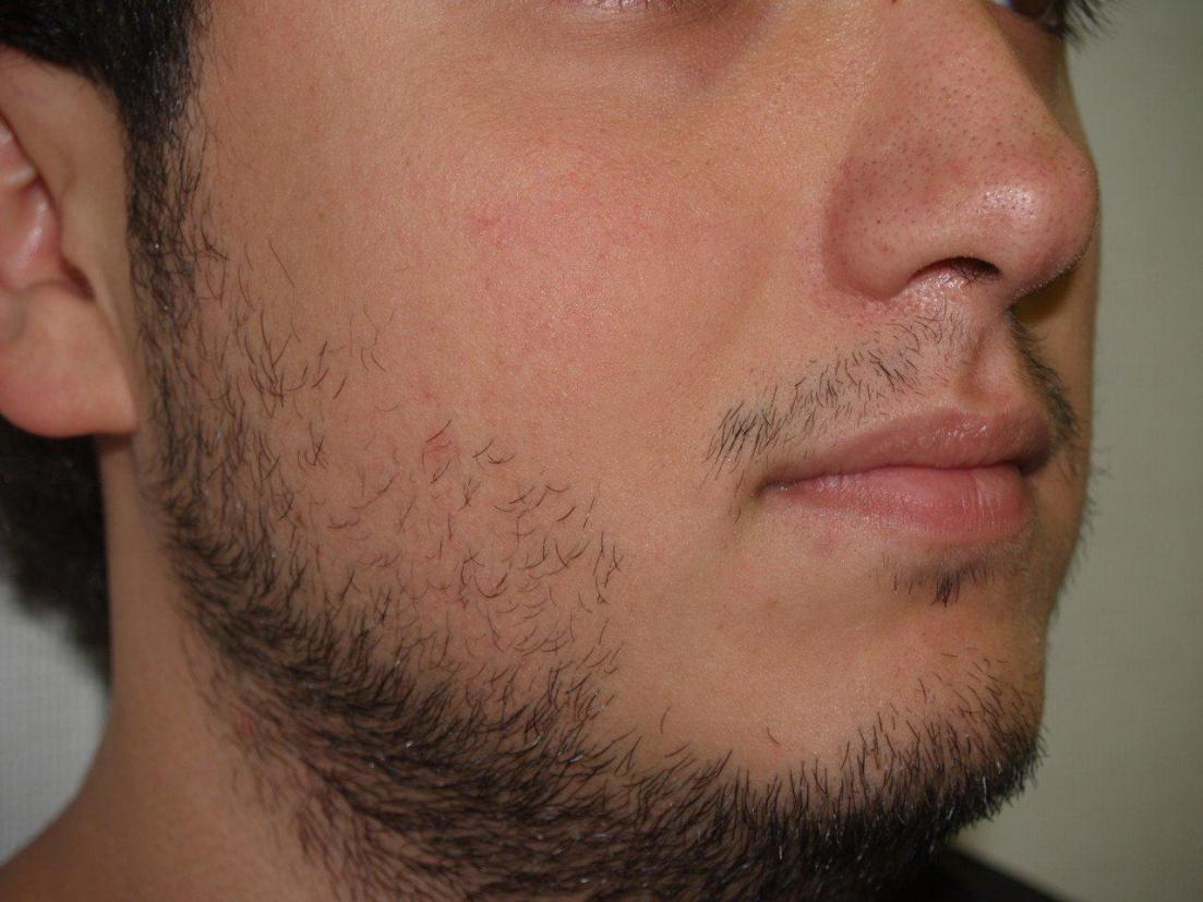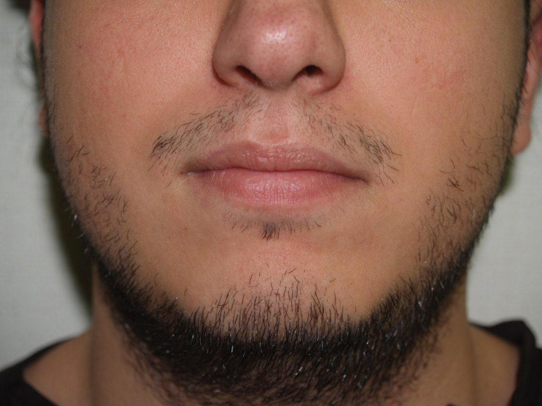 Before and 7 months after 1800 FUE grafts to the beard/goatee region. FUE can effectively be utilized to harvest grafts for facial hair transplants, allowing the patient if he wishes to shave his head in the future. Note that while the donor area was shaved down at the time of the procedure, the surrounding longer hair on top of the area shaved was sufficient for concealing the shaved area. At 7 months after, there is excellent growth of the transplants, and the hairs that were once shaved in the donor area have been growing longer.