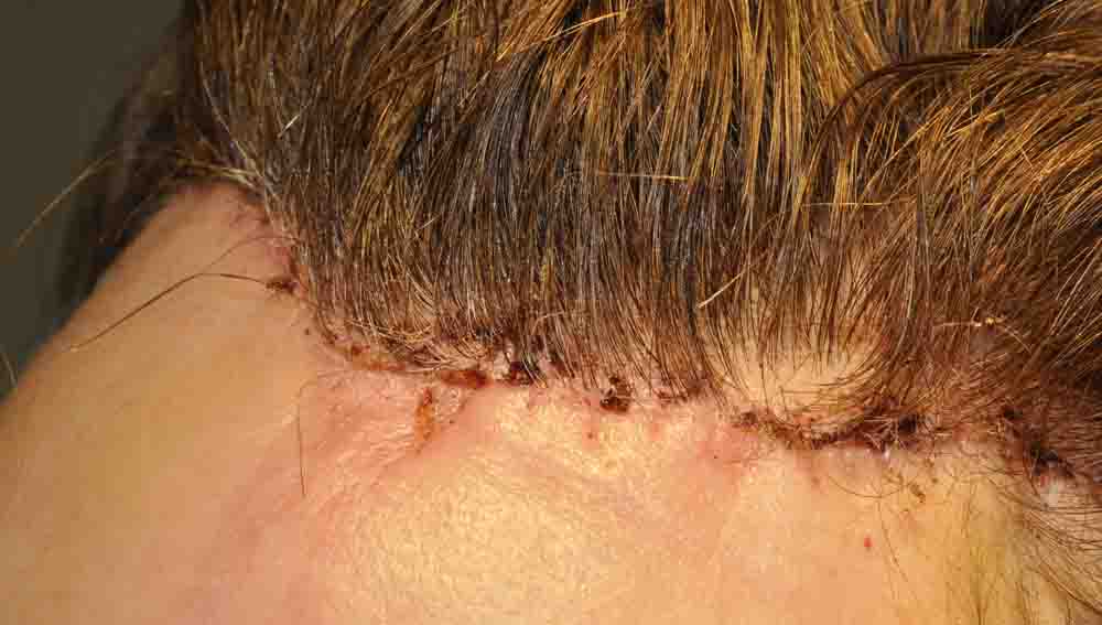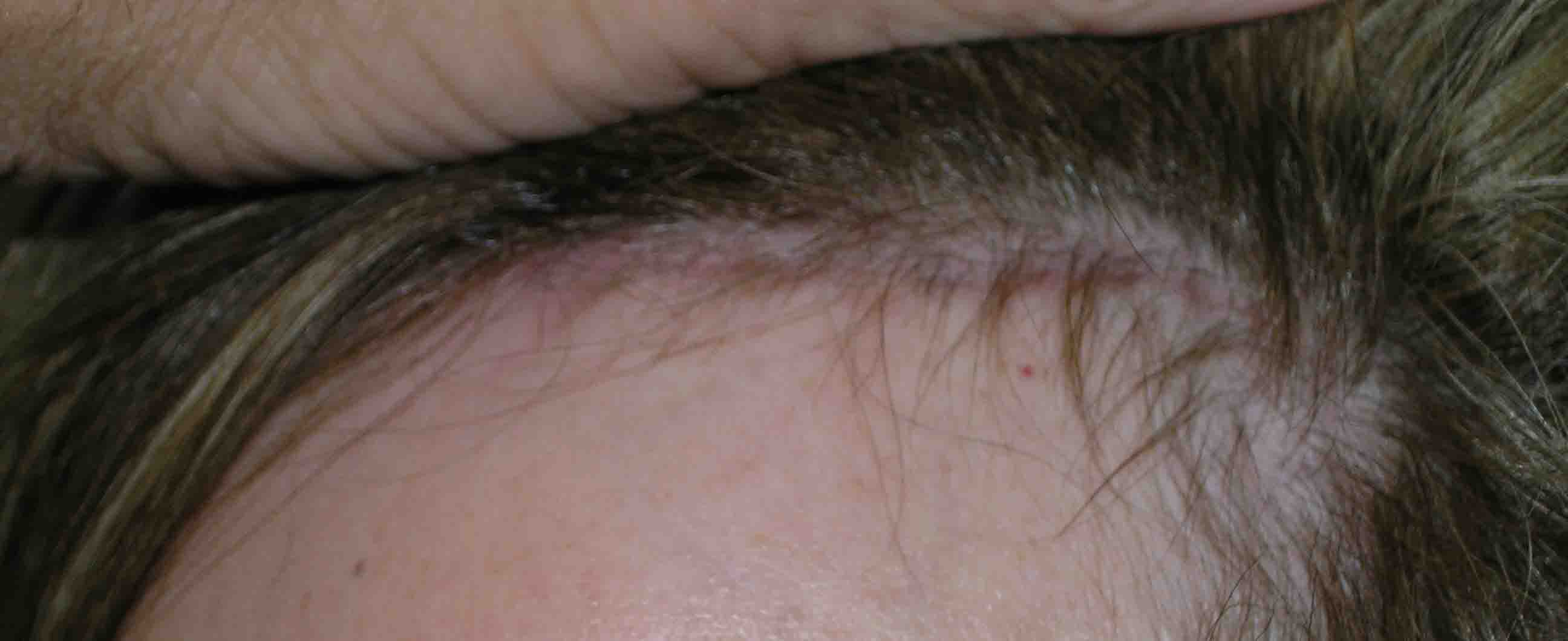 She was a great patient and went back to work on day 6, with minimal discomfort. She'll have a bit of a surprised look for a few weeks, and hopefully in a few months she'll have hair growing out in front of that hairline scar.