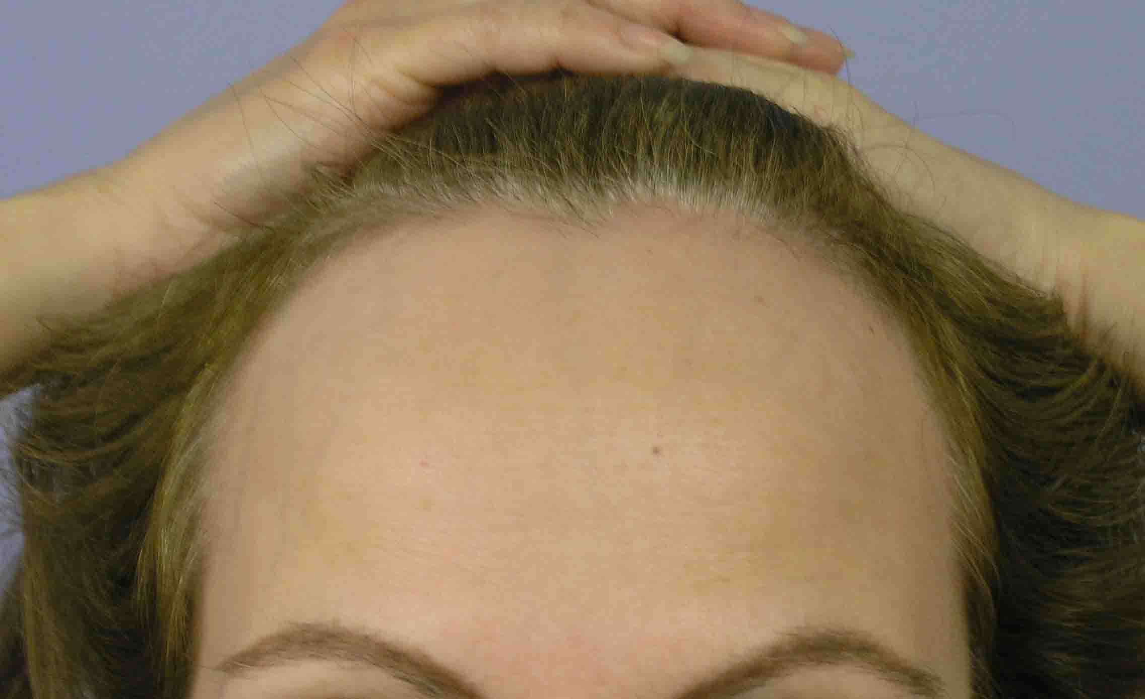 This attractive mid-40s female complained of an abnormally high hairline and large forehead. She'd consulted with 2 hair docs who recommended lots of hair, and one general plastic surgeon who recommended excising forehead skin in front of the hairline and skipping hair work.