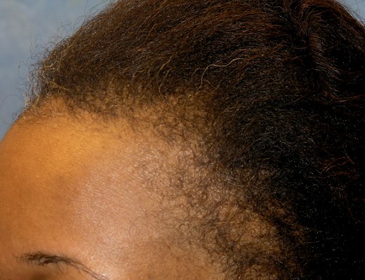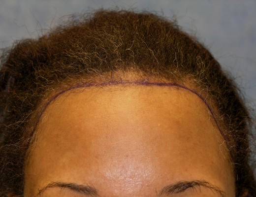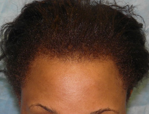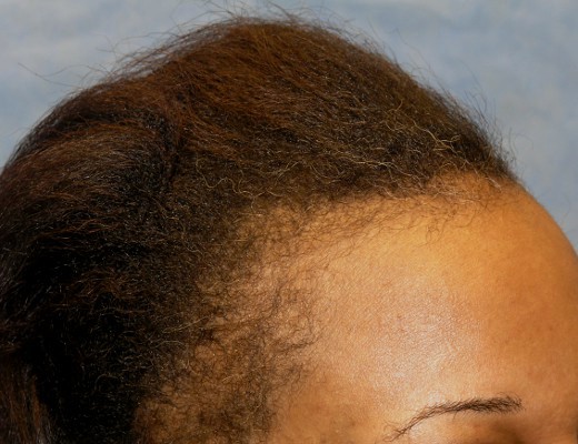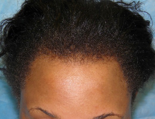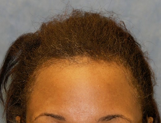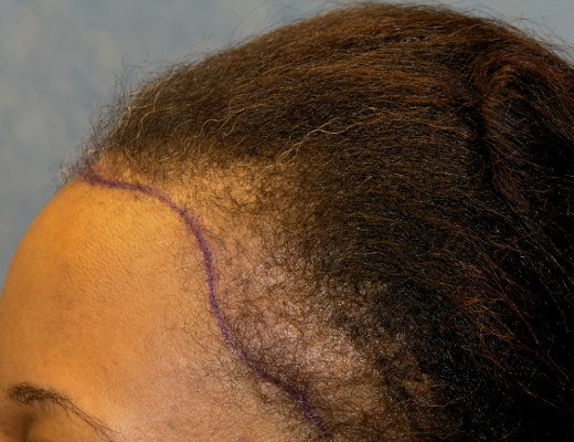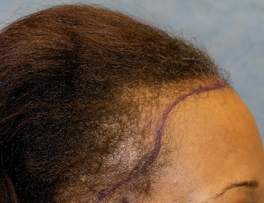 Bernstein Medical - Center for Hair Restoration hair transplant patient BOI is an African-American female with hair loss confined to her frontal hairline and temples. This pattern, called Alopecia Marginalis, is relatively common and is often, but not always, caused by persistent traction on one’s hair. BOI has medium fine hair and a donor density of 1.8 hairs/mm2. Results after only one hair transplant session of 1,698 follicular unit grafts.