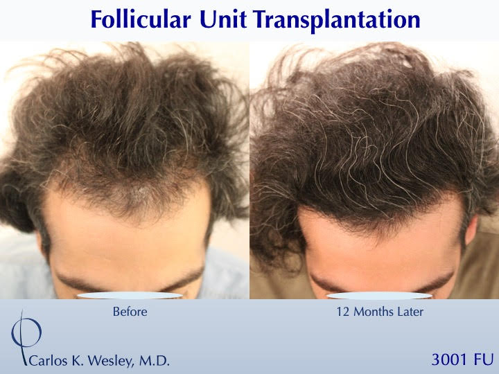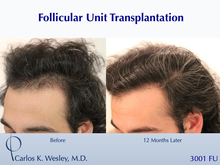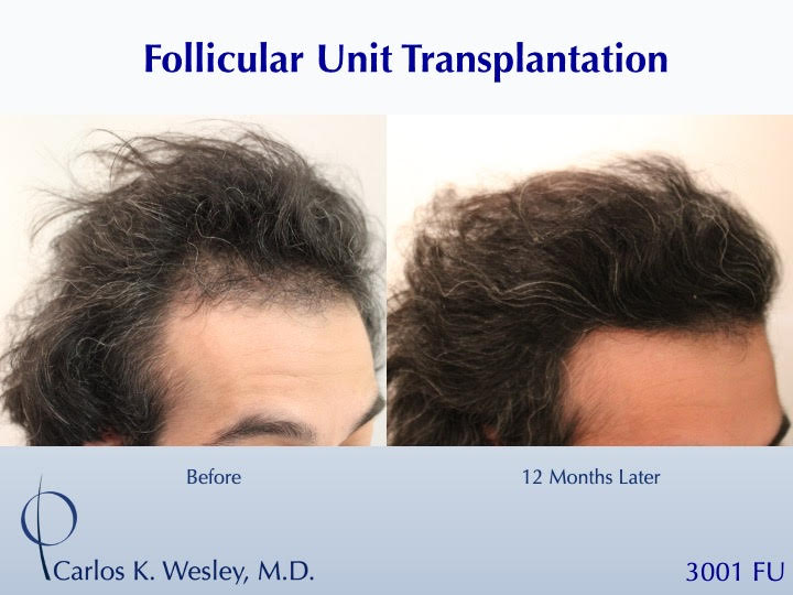 This 35-year-old man underwent a follicular unit transplantation (FUT) session with Dr. Carlos K. Wesley in which a total of 3001 grafts were placed