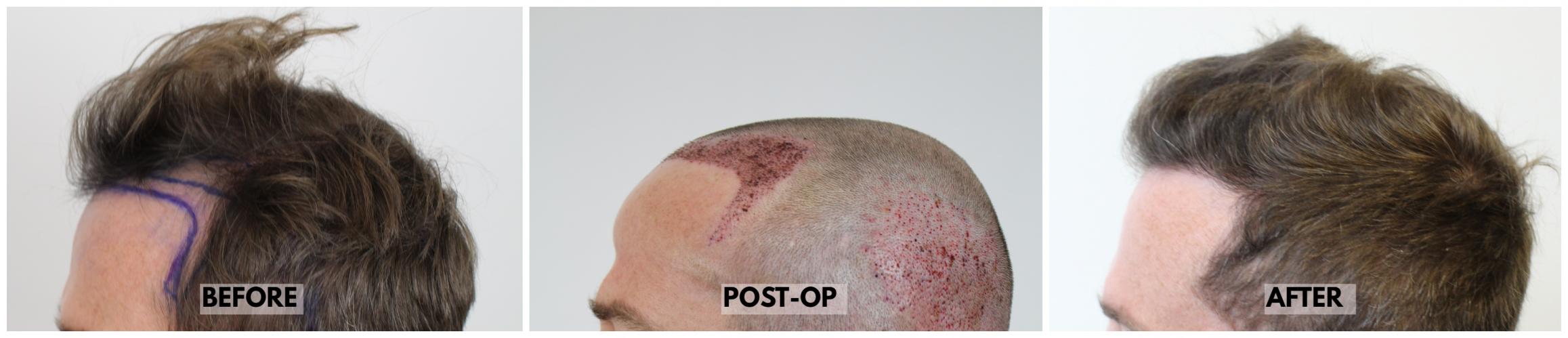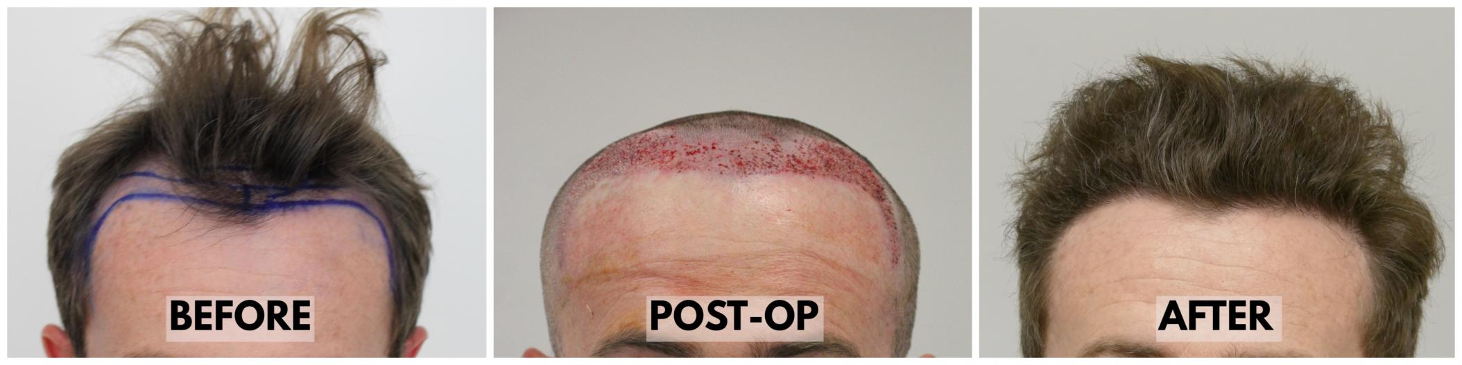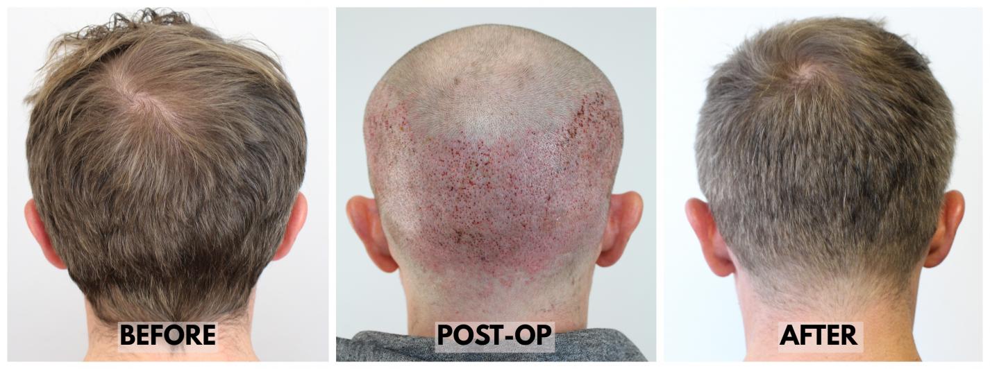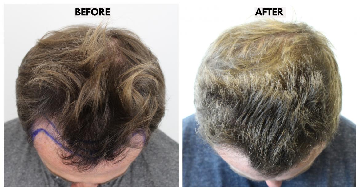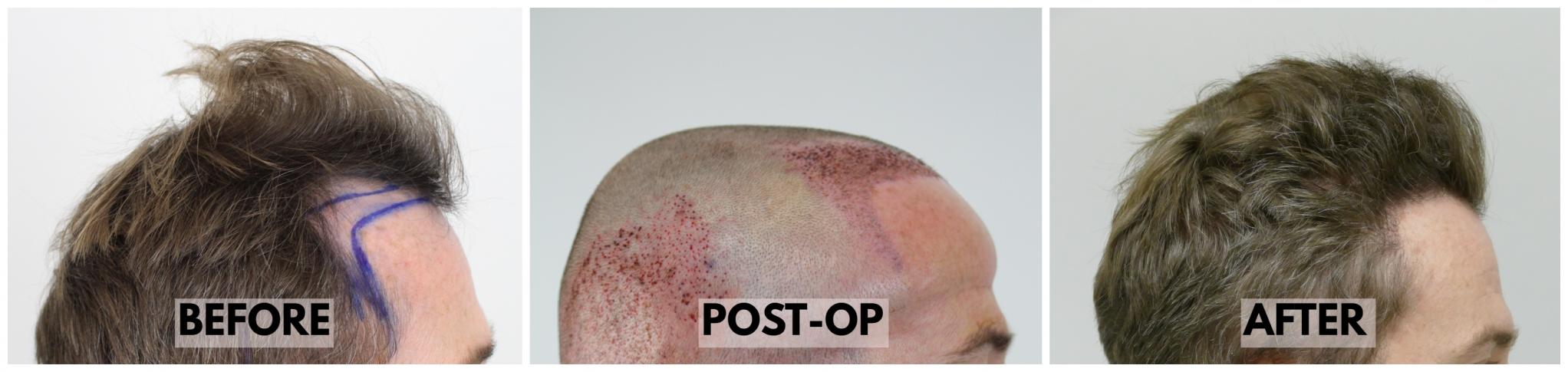At the time of the procedure, the patient was 36 years old and had experienced gradual hair loss since his mid-20s. He began using Rogaine and finasteride a few months prior to the treatment and continued post-operatively. His family history includes hair loss on his maternal side, reaching a Norwood class 5/6.