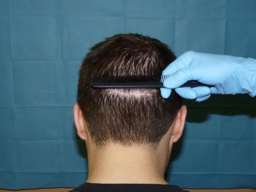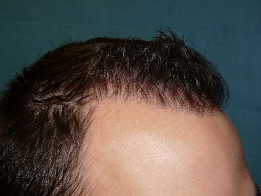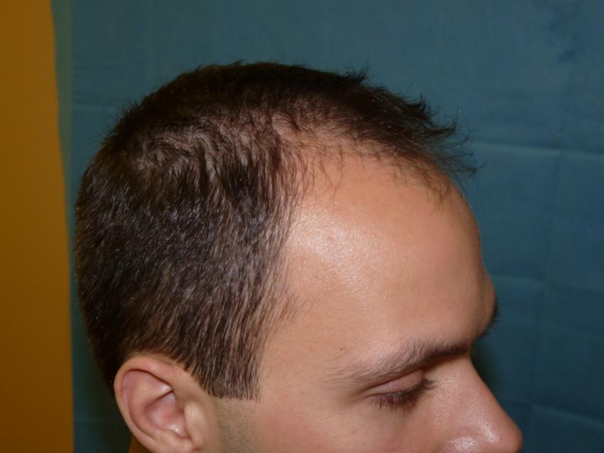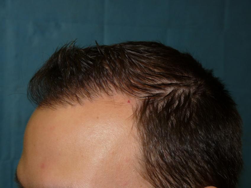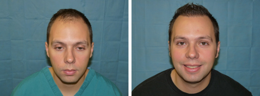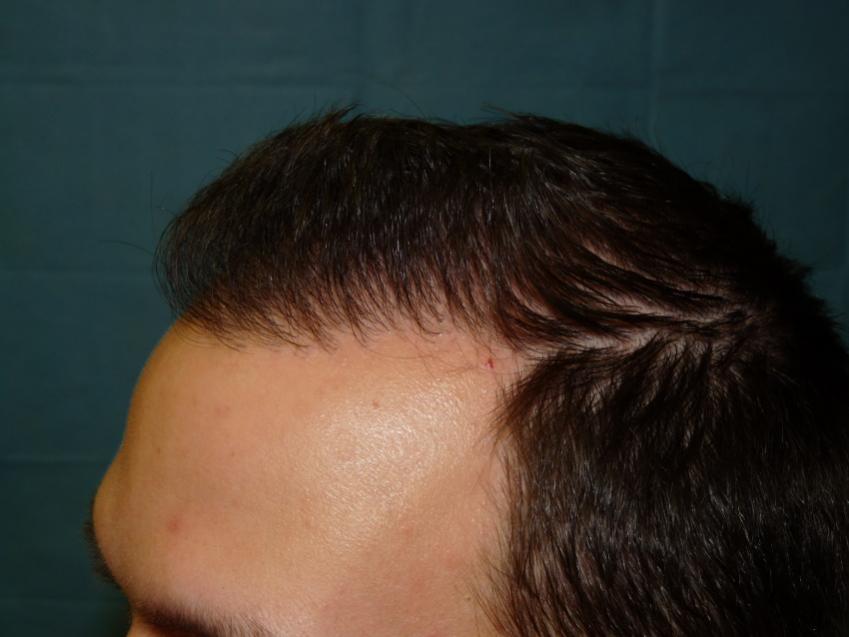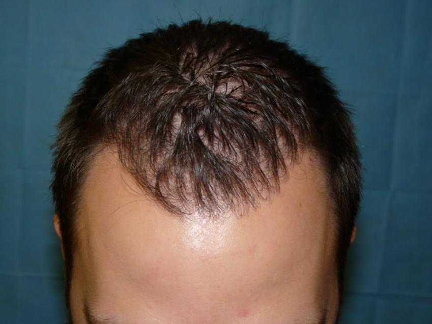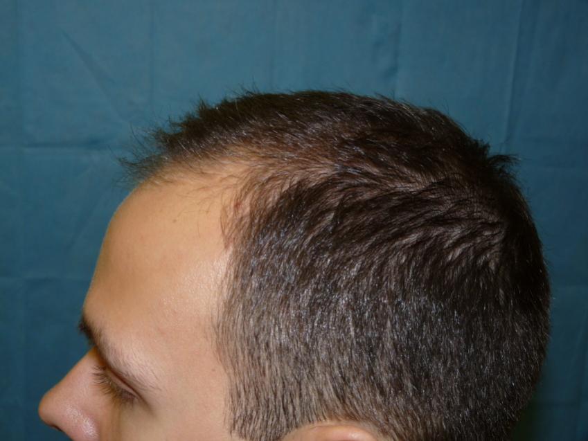 Patient is 25 year old gentleman who had a norwood class 3 pattern hair loss prior to his surgery. He had 2,085 grafts. Taking his age and family hairloss into consideration both us and the patient agreed on a conservative hairline for him. Patient is on Rogaine but does not want to take Propecia. We also agreed on not getting aggressive and trying to remove to large a strip since the patient likes to keep his hair very short. As can be seen in his post-op pictures the donor scar in undectable with his hair very short. We did a tricophytic closure in the donor area. Patient is also able wear his hair spiked up now which he was unable to do prior to his hair transplant.