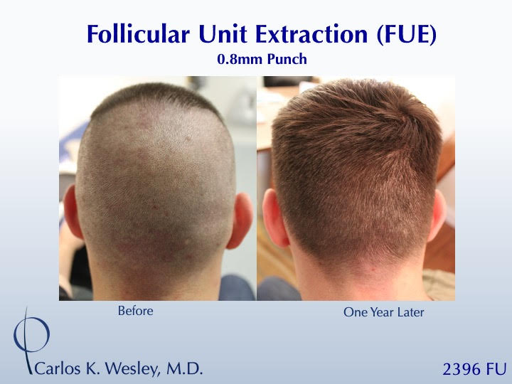 The patient returned one year after his procedure and images of the patient can be seen below. This link illustrates the timing of hair growth after surgery. Similar patient hair transformations with Dr. Wesley and his team may also be viewed.