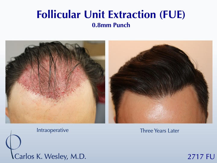This 34-year-old man underwent a follicular unit extraction (FUE) session with Dr. Carlos K. Wesley in which a total of 2717 grafts were placed