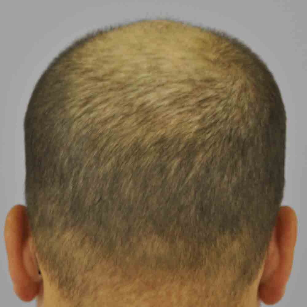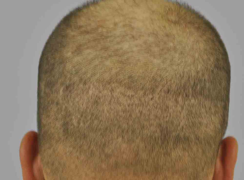 He came back and started with FUEs in August. On our first session, we got around 770 grafts with a 0.9mm Feller punch. By design, and planning on doing one FUE a month for 3 or 4 months, we did the hairline and 2 horizontal "cross-beams" so that I could see what I'd put in at subsequent FUE's. Just about a month later, we did 750 FUEs with a 1.0mm punch, and I must admit, that even at a month, with some expected postop redness still around from session 1, it was a bit hard to see where to put the hairs. But at this point we'd pretty much done the hairline and some of the anterior 1/3 of his nearly bald frontal scalp.