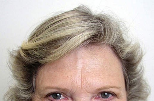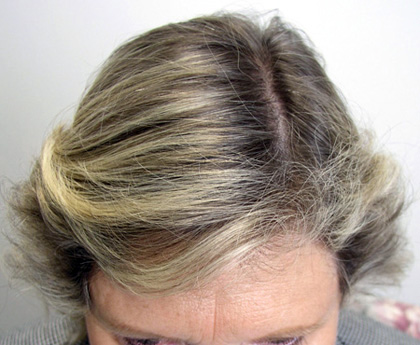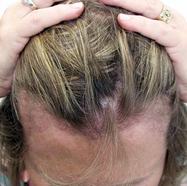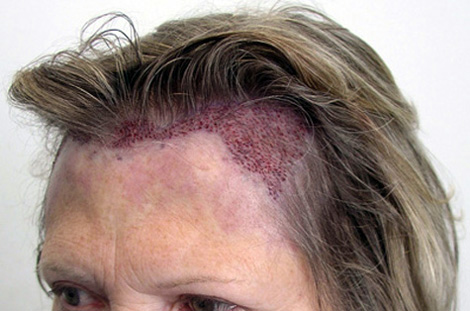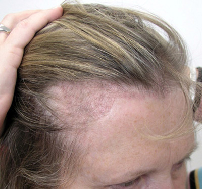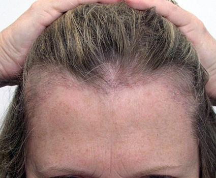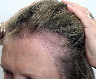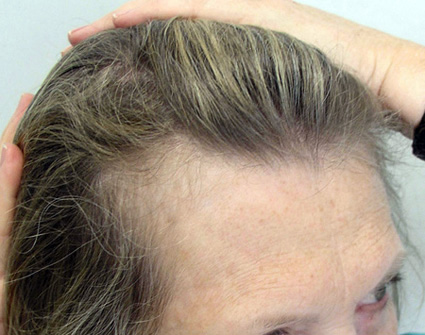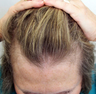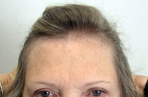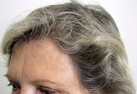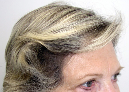 This female patient presented with temporal and frontal hairline recession. Dr. Dorin performed one follicular unit transplant made up of 504 singles and 670 duos. Non-trychophyic closure used. General sequence: Before, Immediately After, 10 days post-op, and result after 10 months.