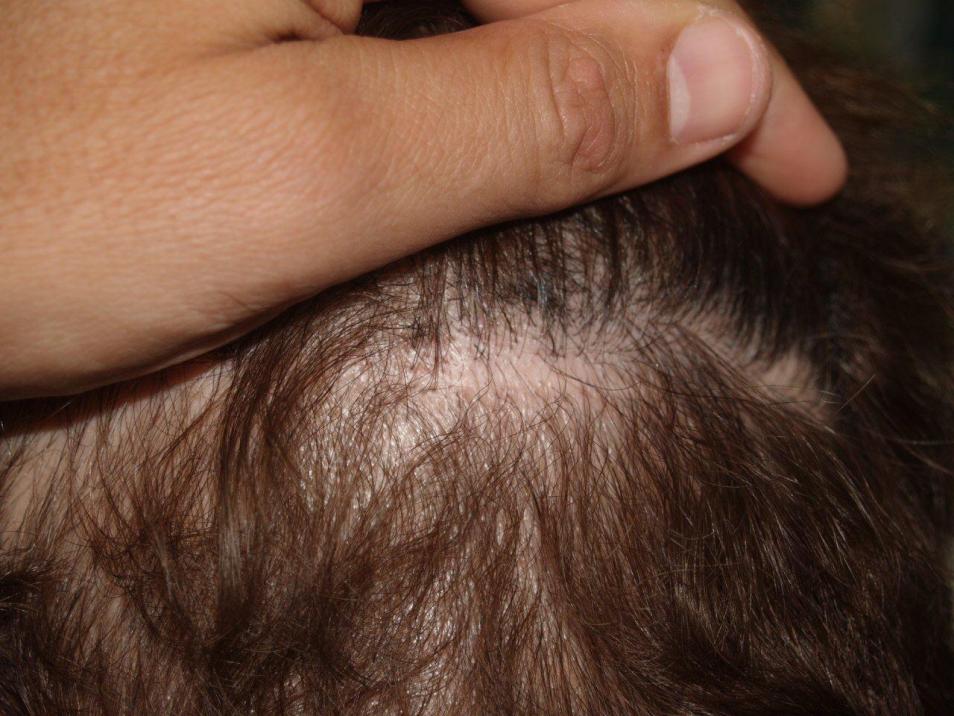 Before and after one hair transplant procedure of 1650 grafts. Note frontal and lateral views as well as close up of the donor site.