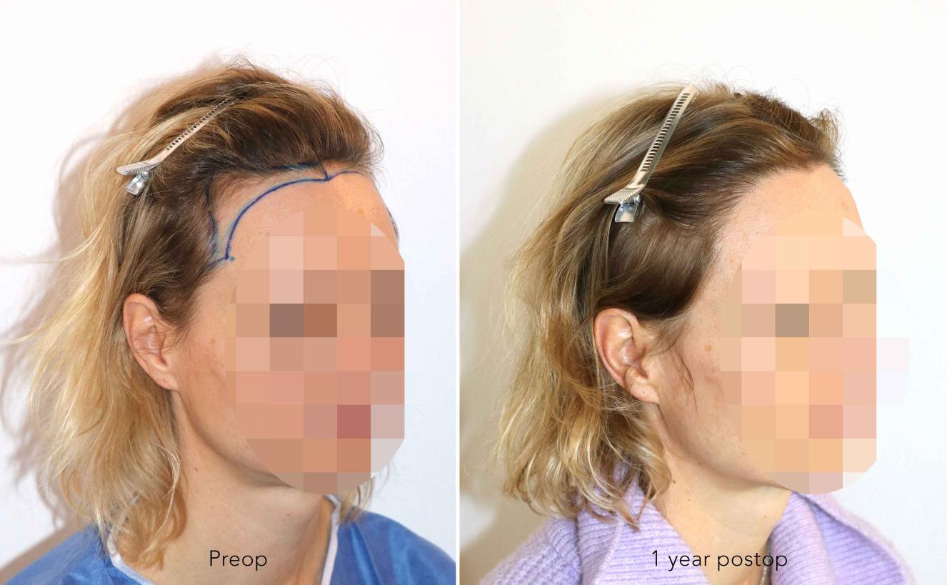 Follicular Unit Extraction to attain an aesthetic reconstruction of the hairline and temporal area.