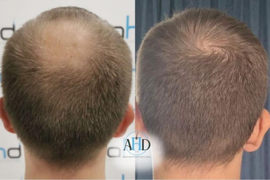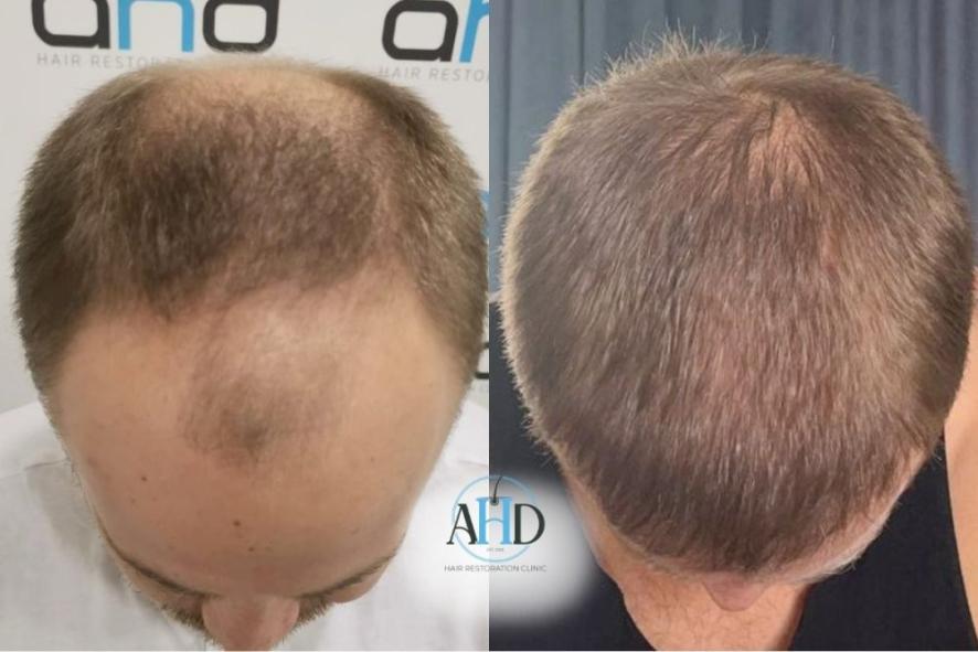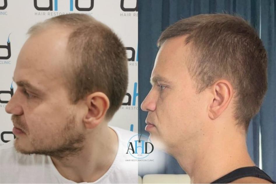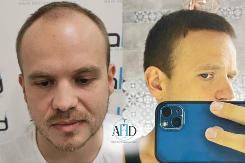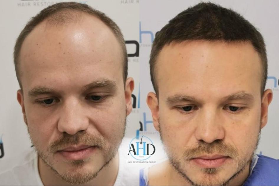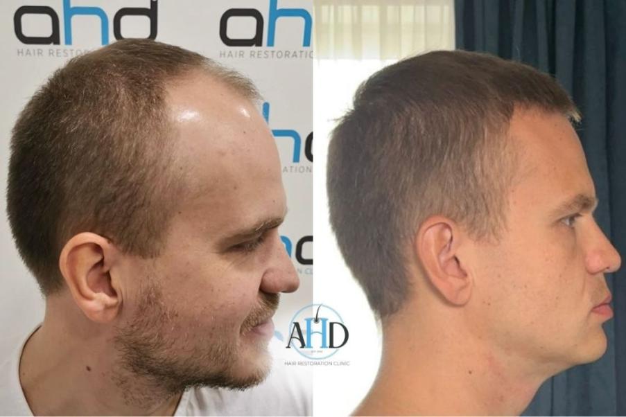 A 37-year-old male patient received two hair transplant surgeries via the DHI method, scheduled at a one-year interval. The initial session targeted vertex restoration, followed by a second procedure dedicated to the frontal hairline. A natural hairline was carefully crafted, with grafts strategically implanted to maximize density and conceal thinning regions.