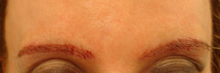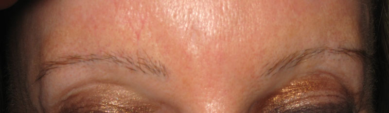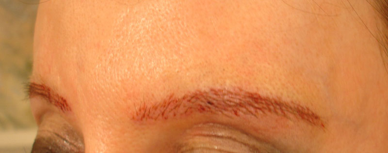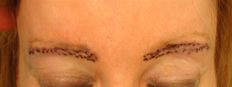 Here is an example of eyebrow transplantation. This may be interesting for a couple of reasons. This procedure follows a brow lift which the patient felt raised the eyebrows too much to result in a "surprised look", a not-uncommon complaint. After the transplant she had the original eyebrows removed with laser. It's interesting how free of scarring or pigmentation changes the result is. These good results depend upon the color of skin relative to the color of hair.