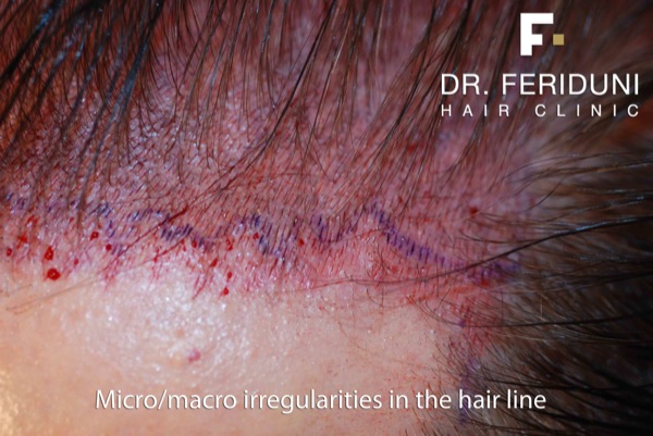 Dense packing technique with a density of 50-55 FU/cm2 in hair line and feather zone (single units), a density of 40-50 FU/cm2 in density zone (double units).