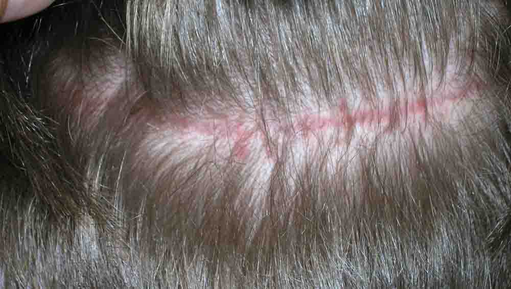 He is showing some growth up front, with alot more to come, and his scar is tough to find...although at a month or so it was fairly red and I was a little worried about it.