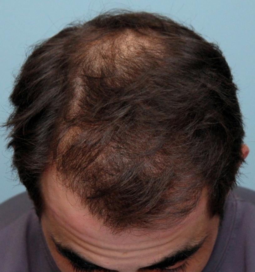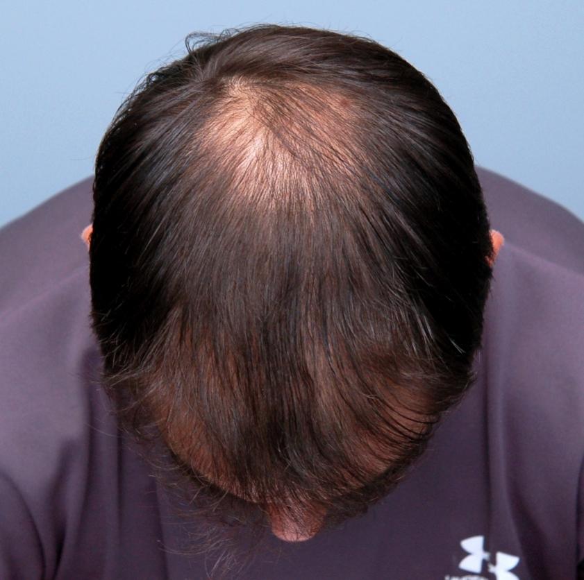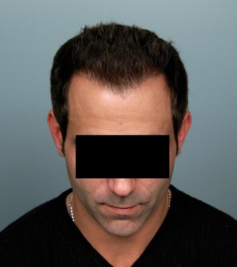 This is an interesting case. This patient first came to us in 2003 at the age of 26 and had type IV hair loss. Although not very apparent in the pre-op scanned photo, he had signs of miniaturization all the way to the crown. He was started on finasteride and we did 2,800 grafts to the front of the scalp. He sent us photos in 2004 and was very pleased. We did not hear from him again until 2010 when he came to see us for another transplant. He had stopped taking the finasteride several years prior and had begun losing hair slowly at first, but then more rapidly. He reported no side effects or problems with the finasteride, just that he had neglected to keep it going, not being sure how much he needed it. We performed another transplant: 3,278 FU's ( 1-889, 2-1624, 3-705, 4-60) covering his entire scalp, including crown.