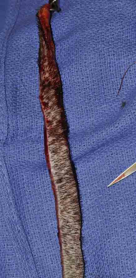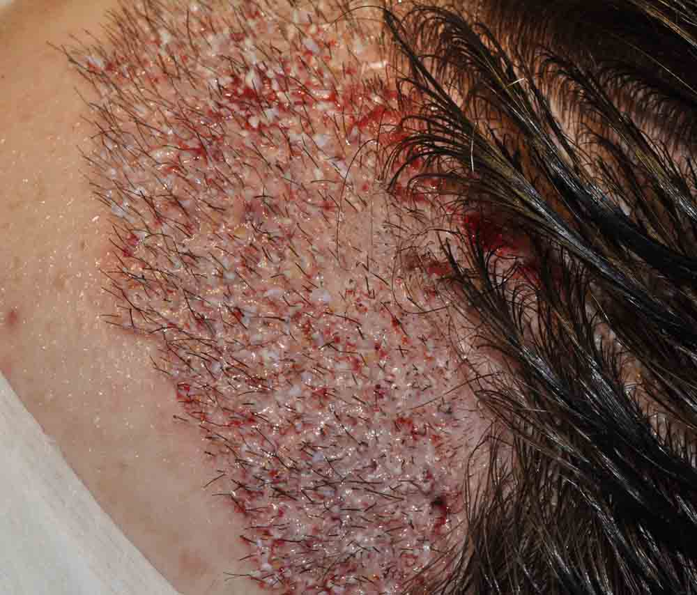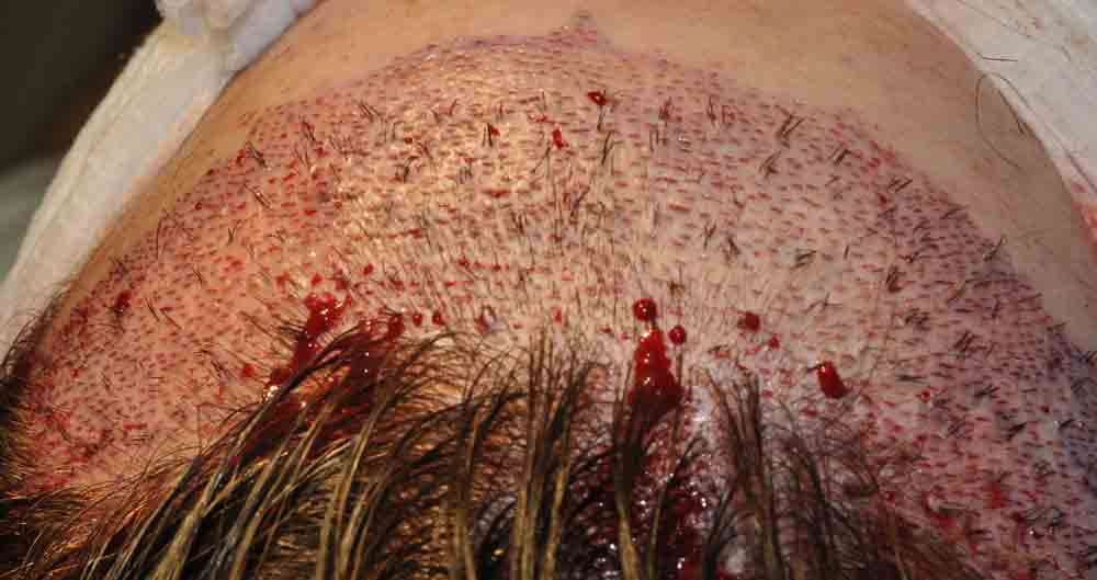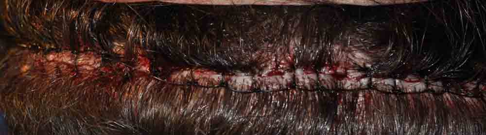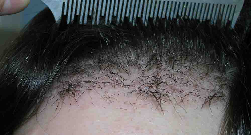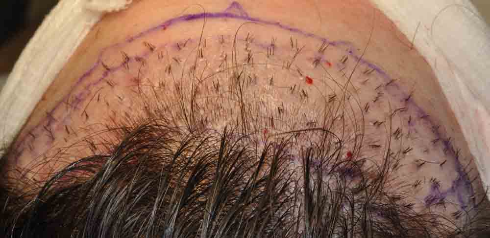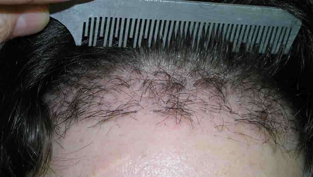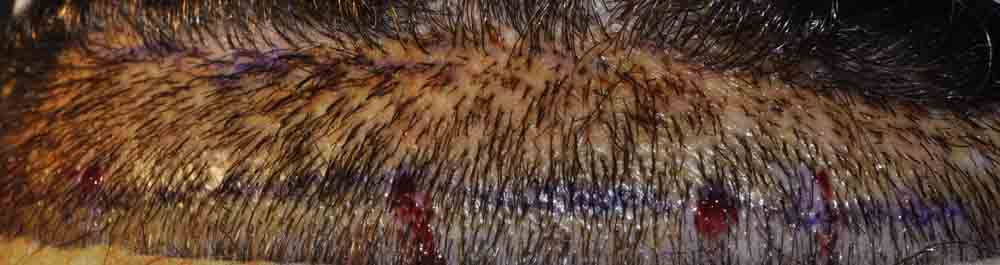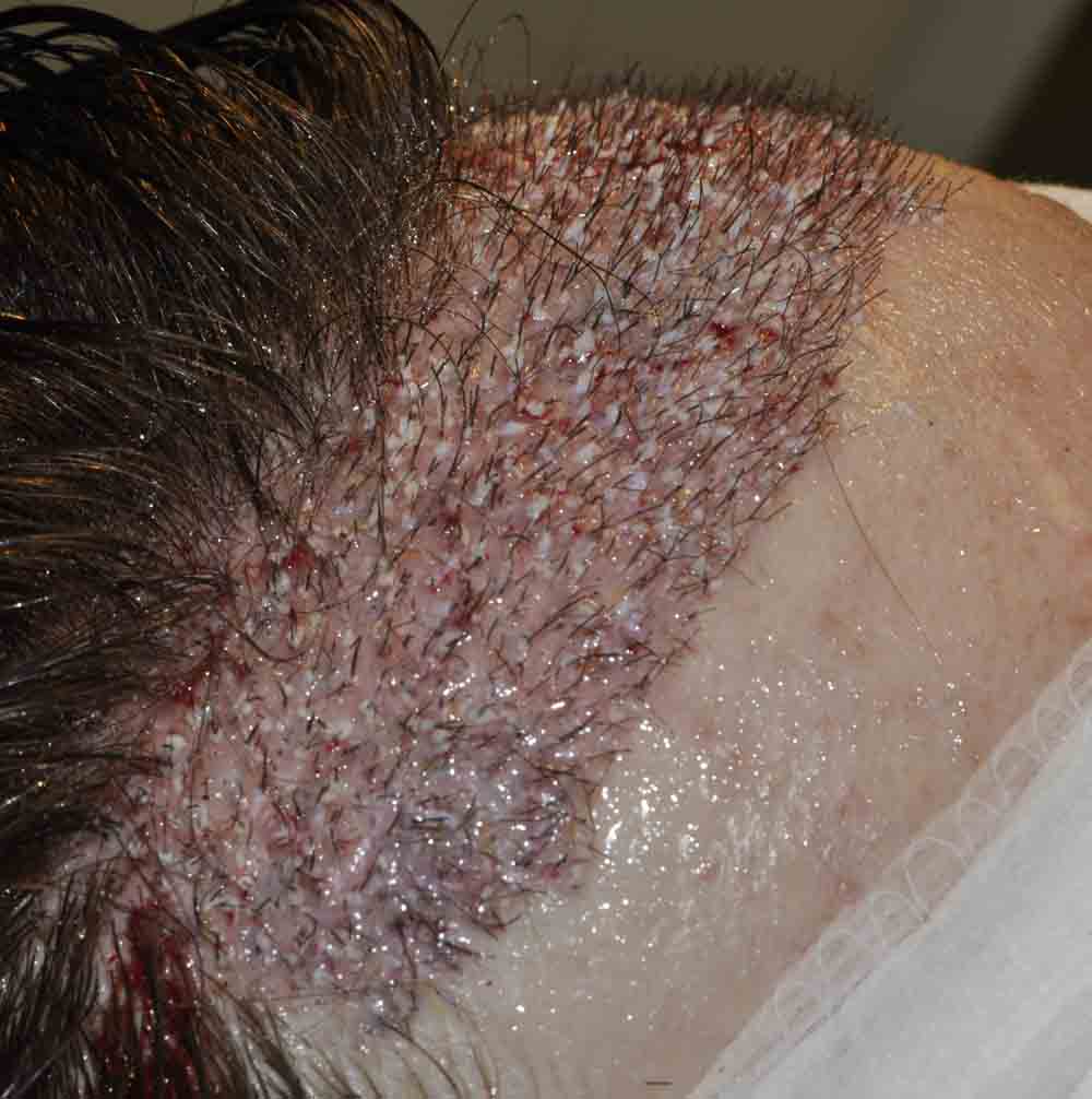 When his hair was cut down to ¼ inch for slit placement, you can count the fairly chuncky grafts previously placed, and we simply packed lots of hair around them and in the entire recipient zone.