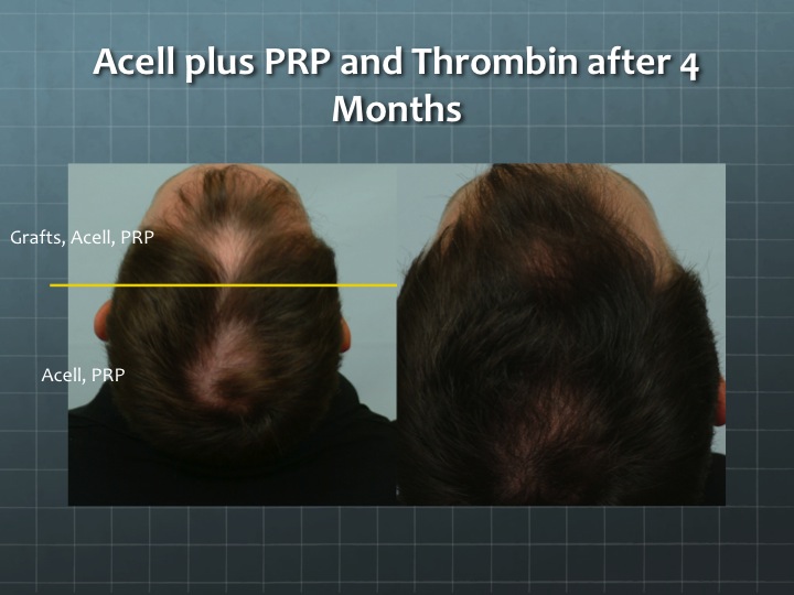 We all know that grafting thinning areas results in better coverage. What remains a mystery is how we can improve coverage by simply injecting the area with PRP and Acell. While not all patients may respond, some do. This is an example of a patient who benefited 4 months out from Acell/PRP in the crown alone with hair grafting, Acell/PRP in the frontal area. Injections alone in the crown area without grafts improved overall coverage. Medical treatment without grafts made a significant improvement.