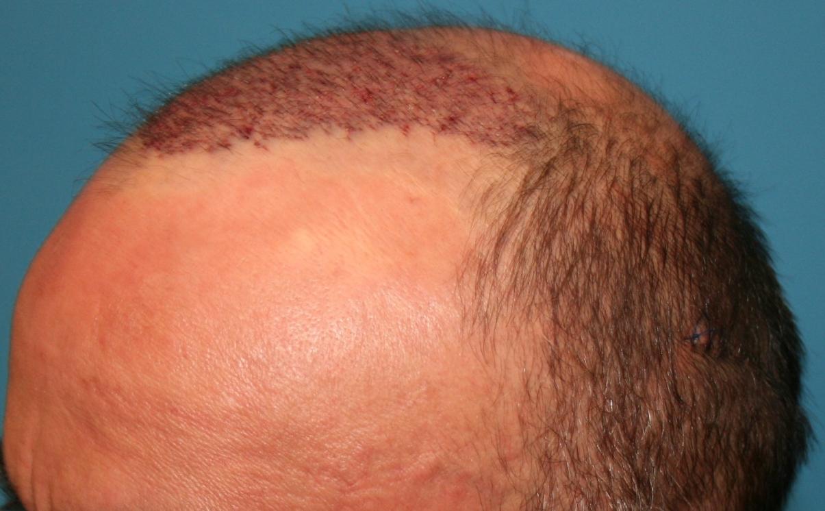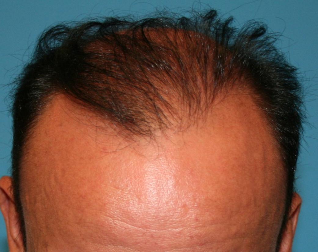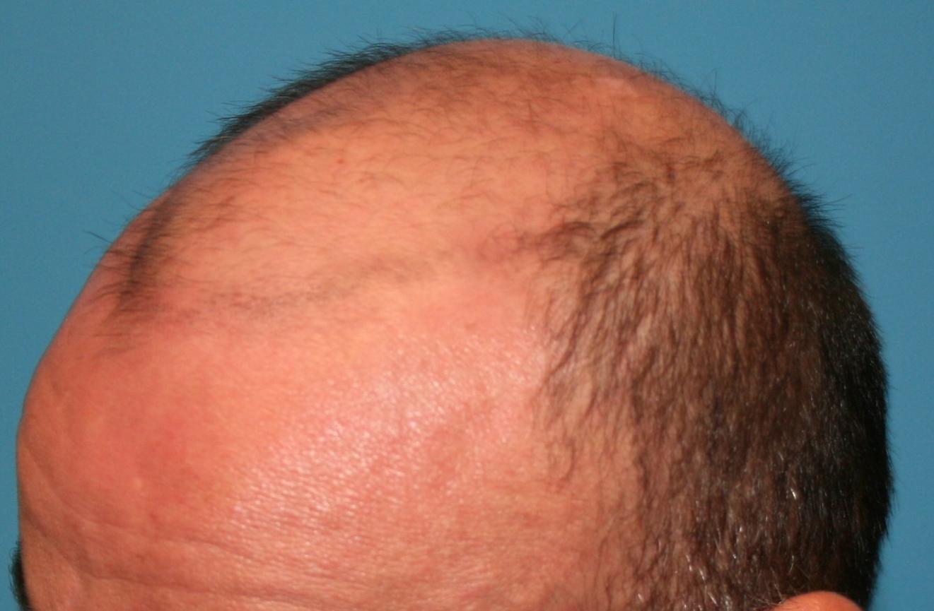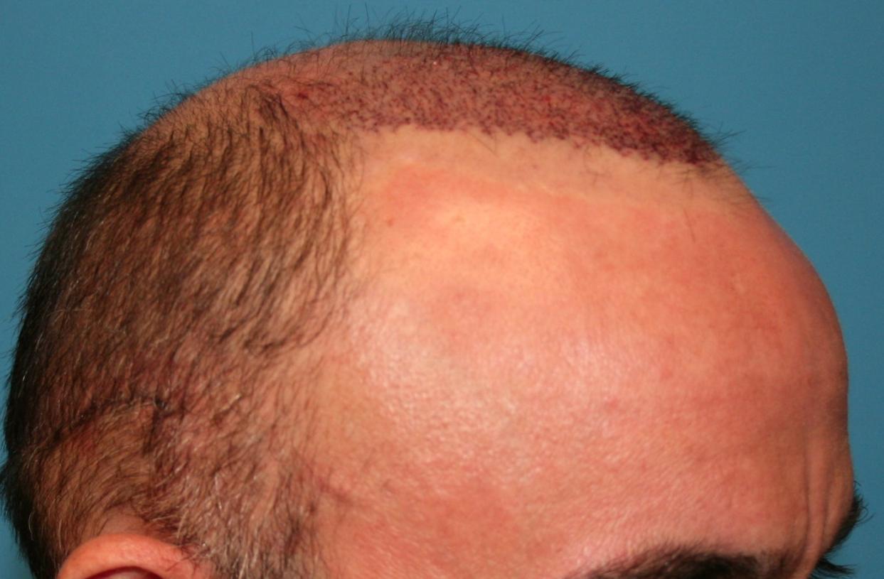 This 44 year old patient had 3500 Follicular Unit Grafts transplanted in his frontal and vertex areas in two sessions. Pictures showing his before, immediate post-op, 6 months post-op and 6 months donor site scar.