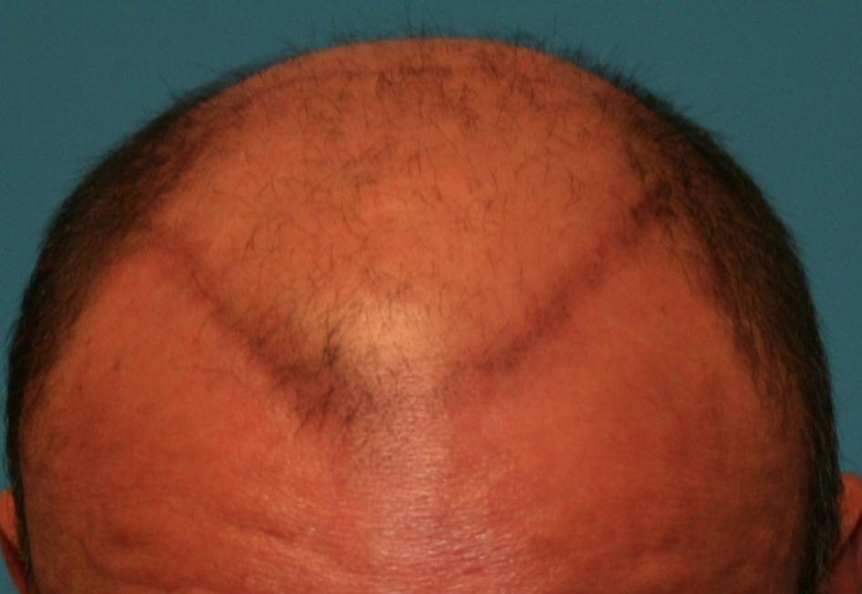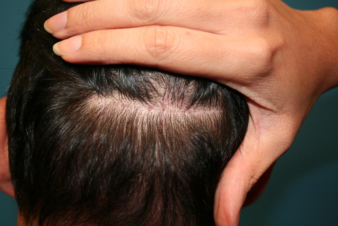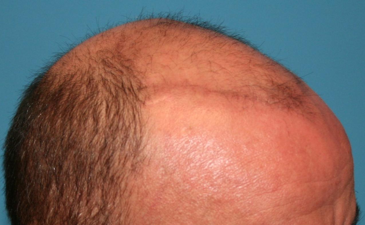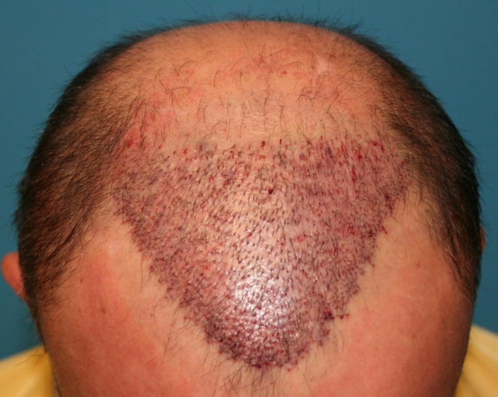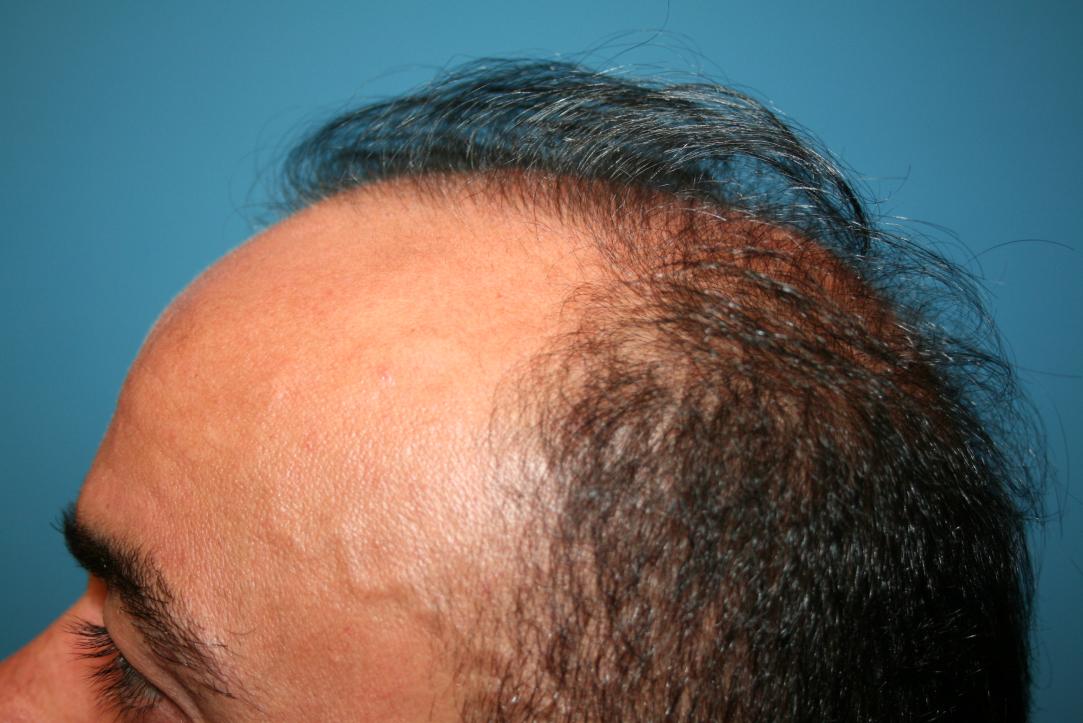 This 44 year old patient had 3500 Follicular Unit Grafts transplanted in his frontal and vertex areas in two sessions. Pictures showing his before, immediate post-op, 6 months post-op and 6 months donor site scar.