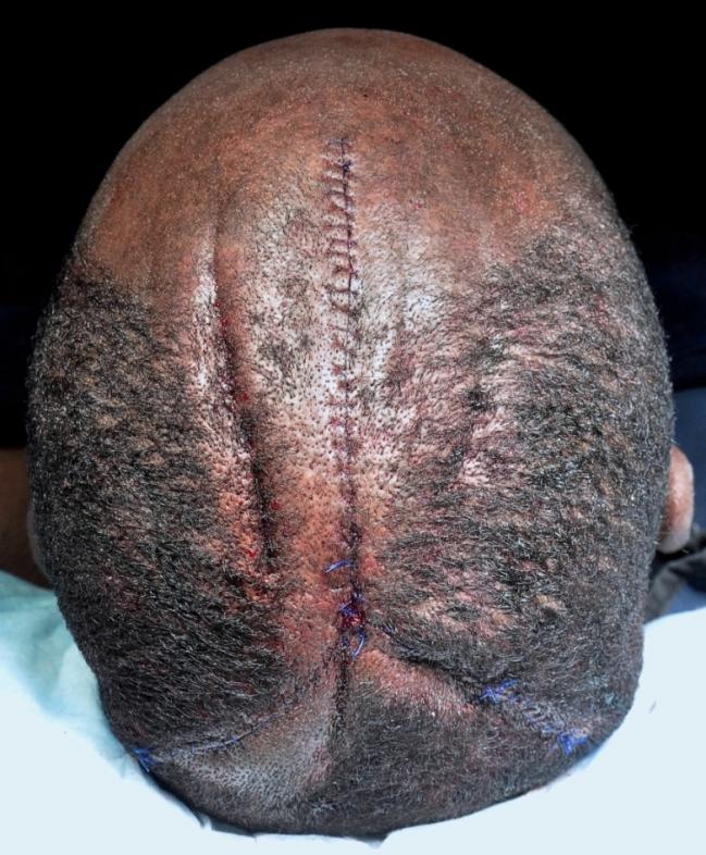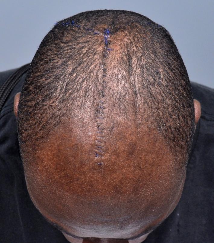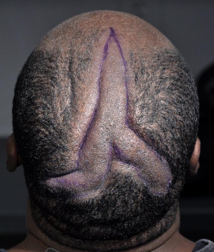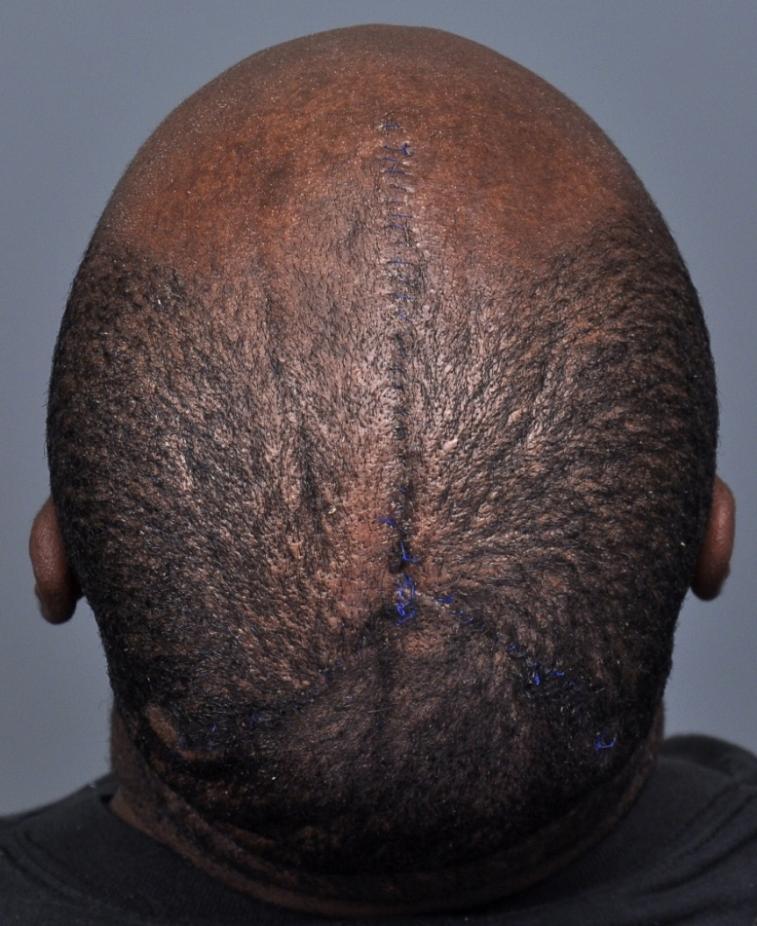 I felt that the best result would come from a scalp reduction followed by a hair transplant. A scalp reduction was performed using a 'Mercedes Star' pattern, allowing removal of approximately 50 cm2 of redundant scalp skin, which removed most of the skin folds. Visible on the op photo is a deep crease to the left of the incision; this crease had smoothed out dramatically by the time of suture removal. A transplant will be performed to cover the scar and remaining folds; followup pictures will be posted if available.