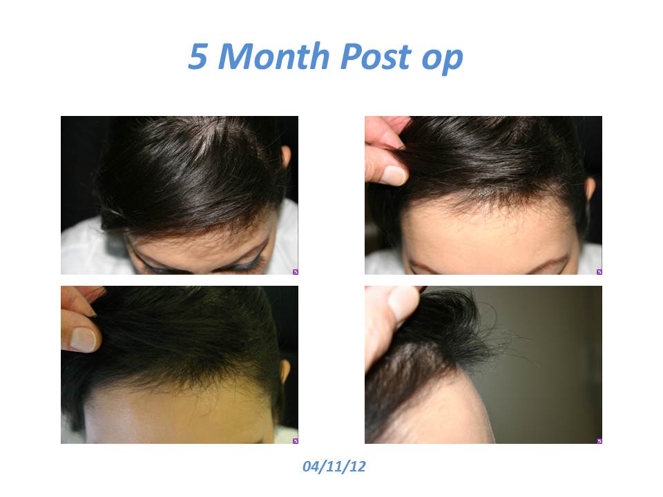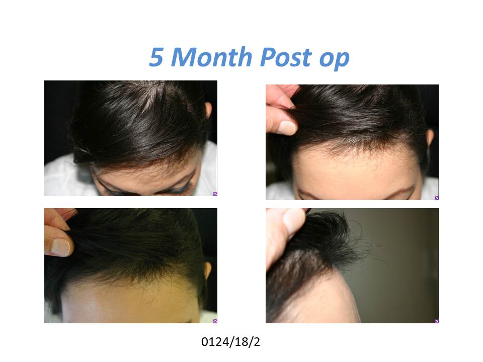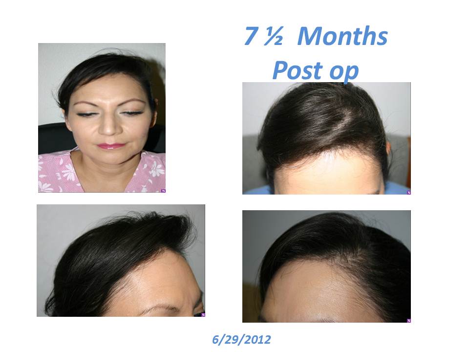 While the 7 ˝ month post op photos show the most dramatic change, the four month post op photos show something often not seen by many who view these posts. Noted in the 4 month post op photo set is the initial regrowth. You can see very clearly her baby fine initial growth growing in nicely at about 1+ cm in length. This baby fine initial growth is often missed by patients, then over the following 3+ month these hairs have not only grown longer, but have acquired greater diameter/mass.
