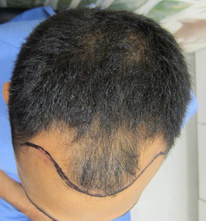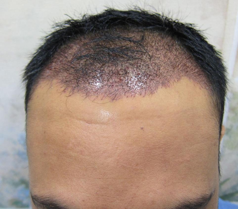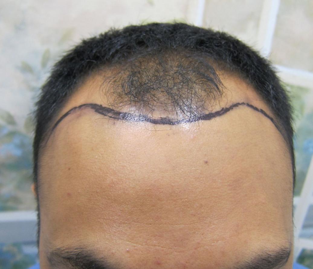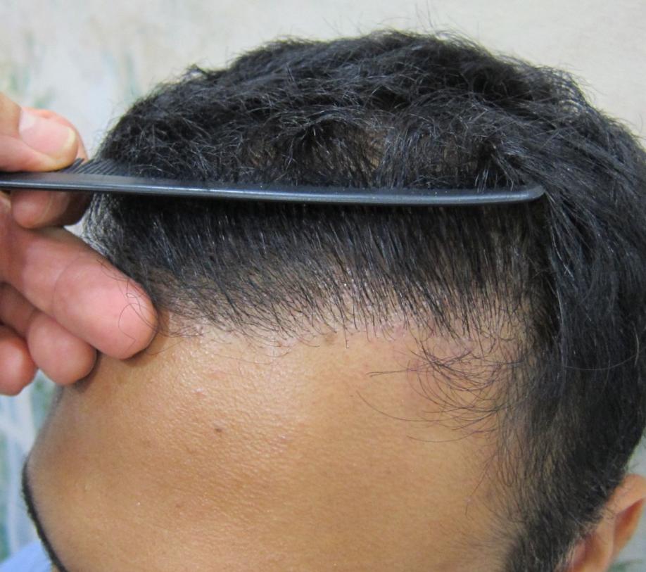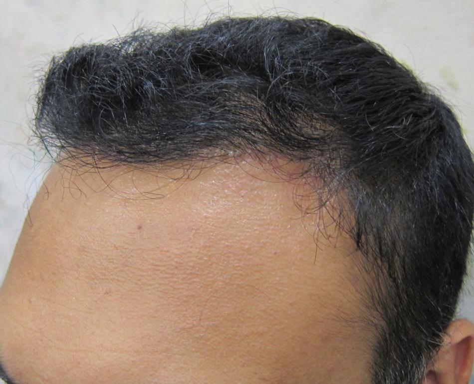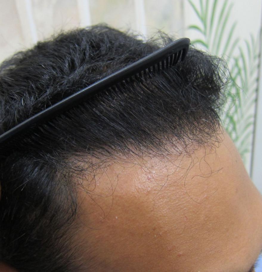 These photos show at 8 months the results of a pattern covering in excess of 70cm2. We were able to obtain a total of 2324 grafts from a maximum harvest that wasn't as long a strip as usual due to decreased density above the ears and a donor density that is somewhat below average (see photo). The strip width was as wide as 1.5 cm. The fullest result possible was imperative due to an important upcoming life event. I would submit that a styling dependent full look will be achieved for this upcoming event in another two months when the hair of the mid frontal forelock grows longer to allow more hair mass to cover the thin area shown in the photos. Looking at the uniformity of the graft growth at the hairline, I think most of the grafts are growing at 8 months. However, there may be some more hair mass from the grafted hairs attaining their longer, optimal lengths. A second procedure may be necessary just for ease of achieving a style that will be durable enough for wind and water.
