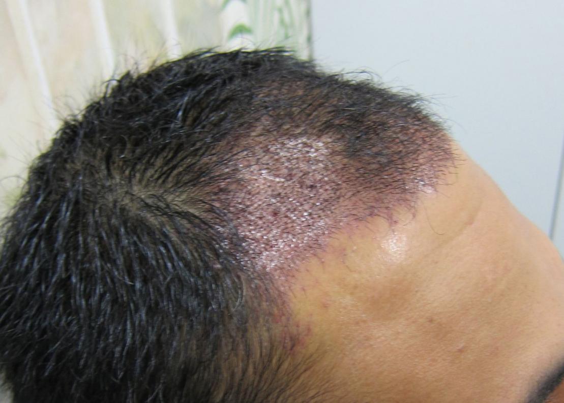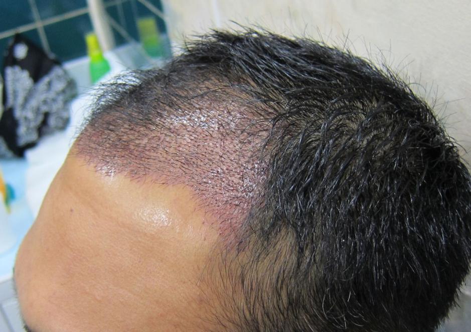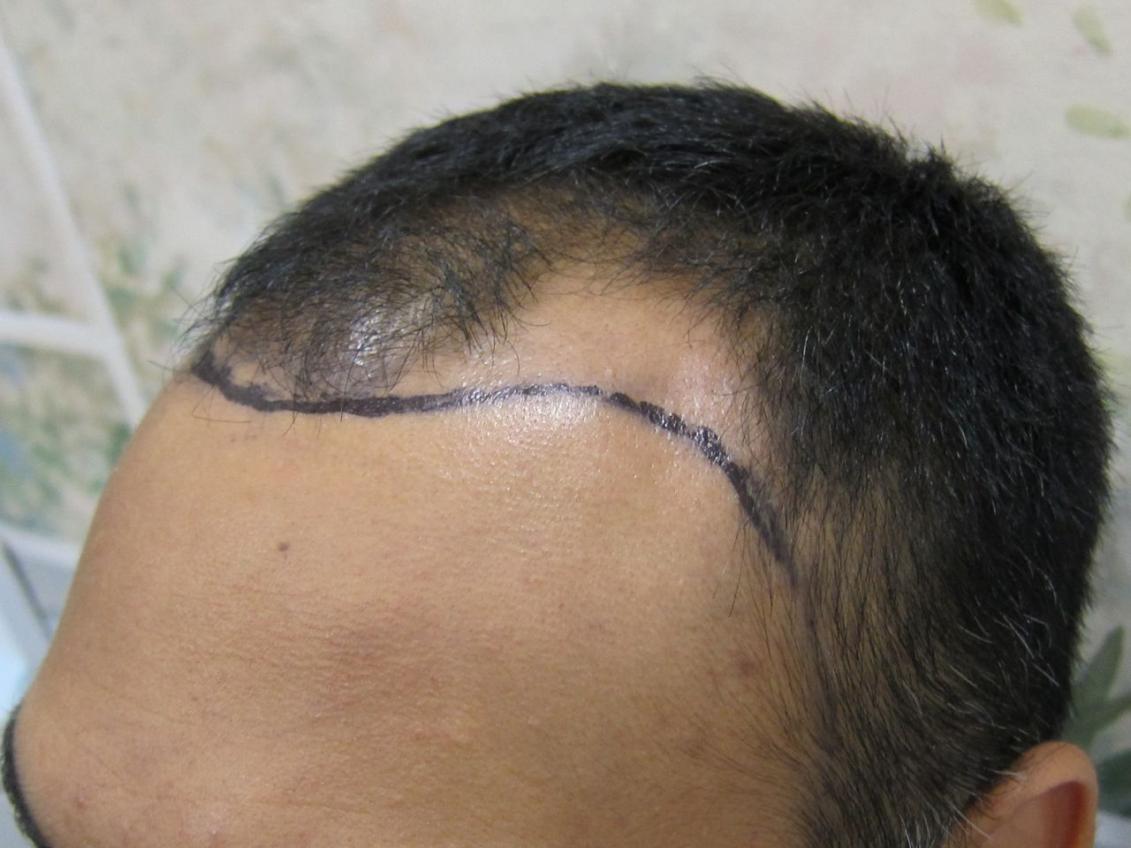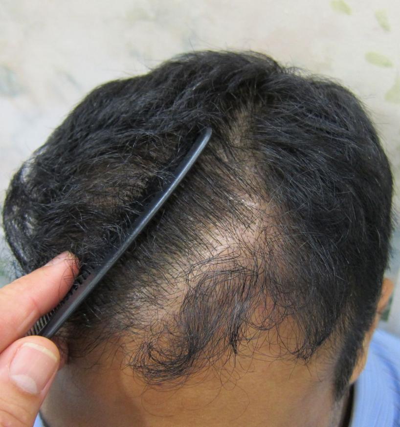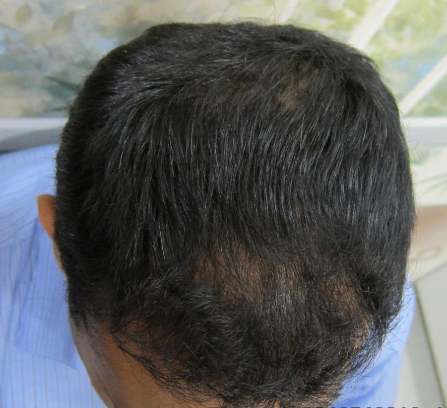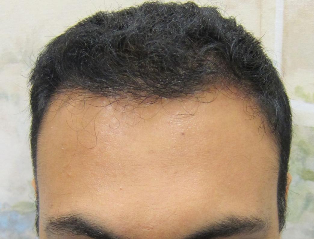 These photos show at 8 months the results of a pattern covering in excess of 70cm2. We were able to obtain a total of 2324 grafts from a maximum harvest that wasn't as long a strip as usual due to decreased density above the ears and a donor density that is somewhat below average (see photo). The strip width was as wide as 1.5 cm. The fullest result possible was imperative due to an important upcoming life event. I would submit that a styling dependent full look will be achieved for this upcoming event in another two months when the hair of the mid frontal forelock grows longer to allow more hair mass to cover the thin area shown in the photos. Looking at the uniformity of the graft growth at the hairline, I think most of the grafts are growing at 8 months. However, there may be some more hair mass from the grafted hairs attaining their longer, optimal lengths. A second procedure may be necessary just for ease of achieving a style that will be durable enough for wind and water.