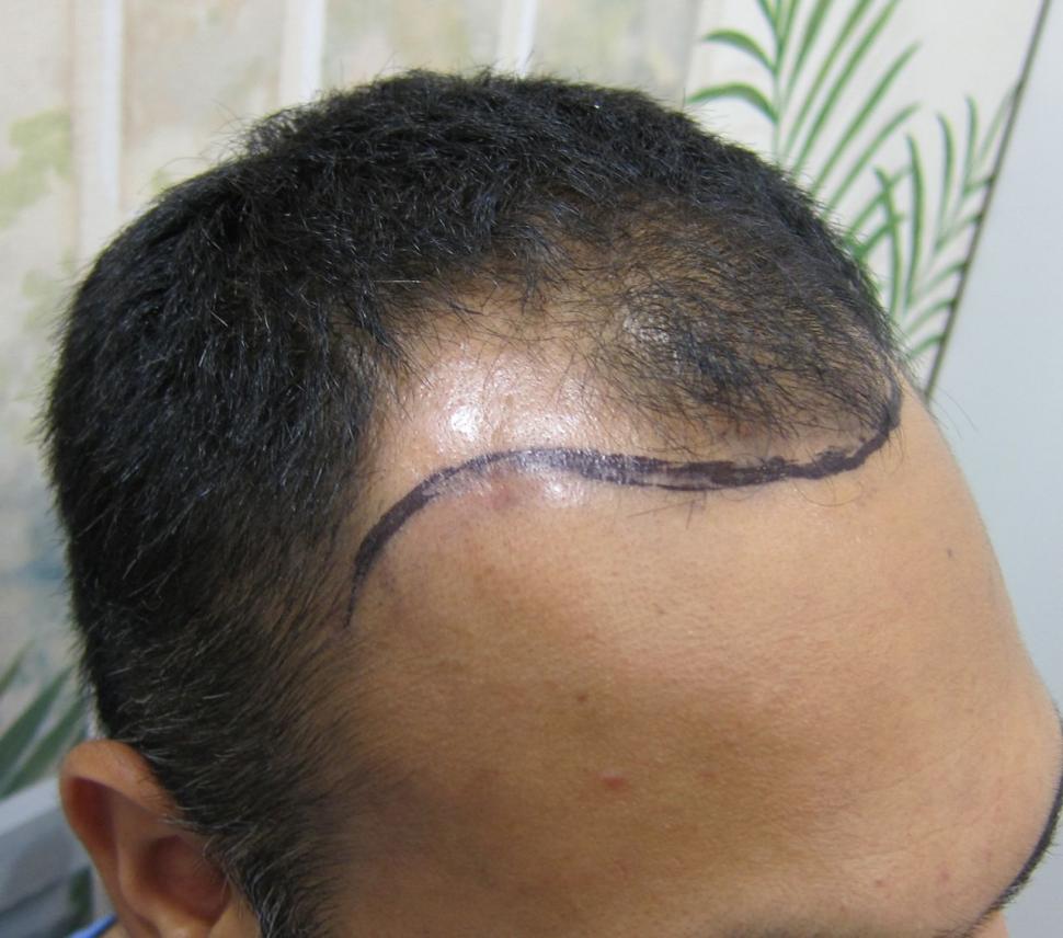 Hair transplantation is a very satisfying procedure both to the patient as well as his doctor. The most common dissatisfaction, however, comes from disappointment in the density achieved with one procedure. The solution, if such dissatisfaction occurs, is another procedure to increase the density, but this roughly doubles the expense for the patient. One procedure has several important characteristics that need to be understood by the patient in order to avoid this disappointment: 1. Common consensus is that the maximum density that can result in reliably good growth is around 40 graft sites / cm2 for 2 and 3 hair FUGs and perhaps 50 / cm2 for the one hair grafts at the leading edge of the hairline. 2. The density achieved from this density is perhaps a 60% dense result. ("Fullness" is more optical than mathematical and is impacted by factors other than just density including hair fiber diameter, color of hair vs the skin color and waviness of hair. "Fullness" is also often more a reflection of "hair mass", i.e., hair diameter, length as well as density.) 3. At maximum density 2800 grafts will cover only approx. 70 cm2 (2800 / 40 = 70). Most people have more than 70 cm that require some coverage as in this case shown here. Therefore, certain areas will have less density than 40 sites / cm2 and the resultant, theoretical 60%. 4. These points mean that one procedure will be more "styling dependent" than, for instance, doubling up the density with a second procedure.