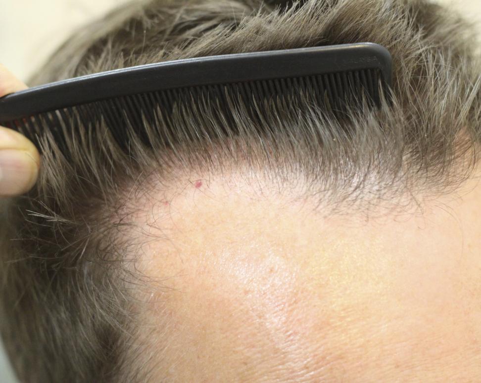 Pt is a thirty two year old male with a family and personal history of androgenic alopecia affecting the frontal hairline/frontal forelock area. The patient's complaint was an inability to style what was left of his frontal forelock/hairline to anything that even closely resembled strong healthy hair.... Our goal was to reinforce the existing frontal forelock area while recreating a conservative advancement of the temporal recessions while further defining the frontal hair line. Note we have maintained some recession so that should this patient experience further loss, this can be addressed successfully as we have not "set the bar too high" by creating a less receded hairline. 1848 total FU grafts; 1075 one's; 581 two's; 192 three's.