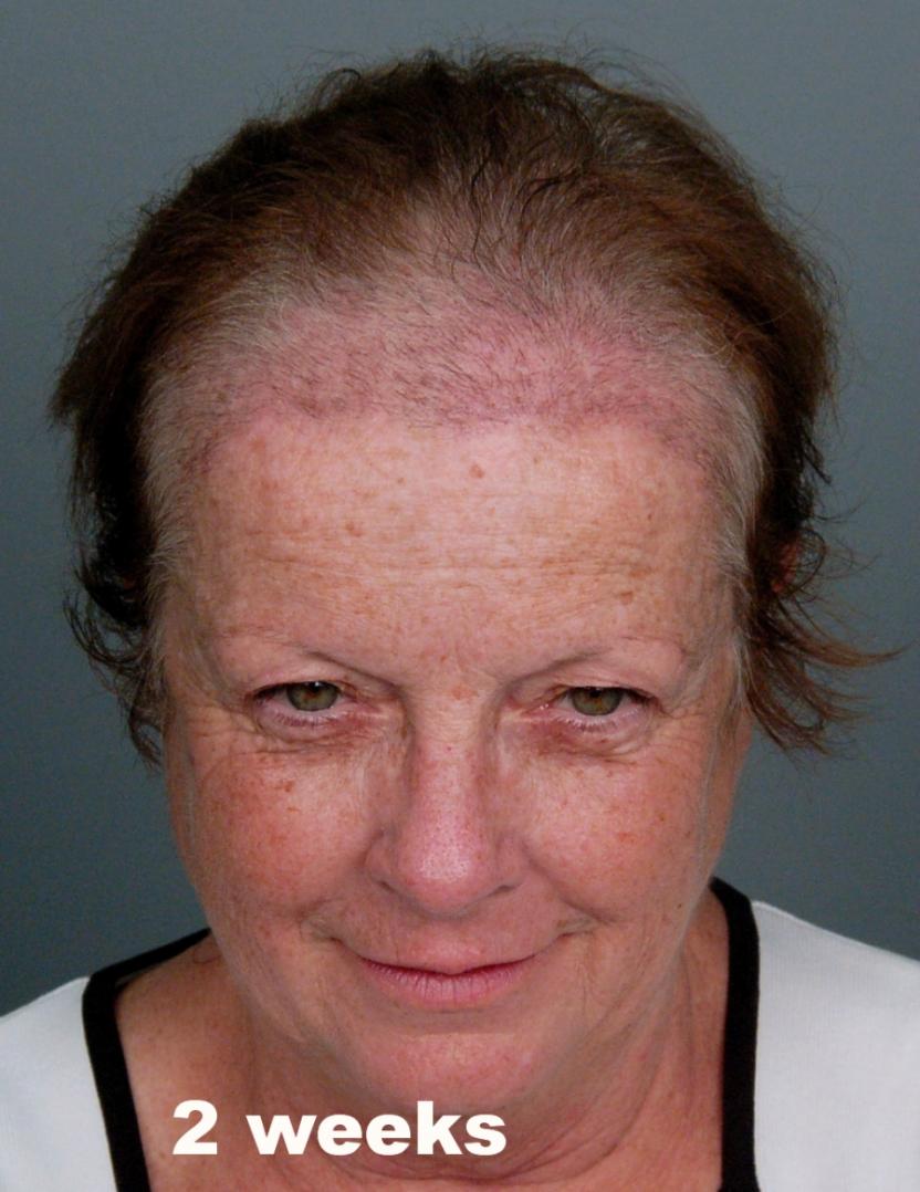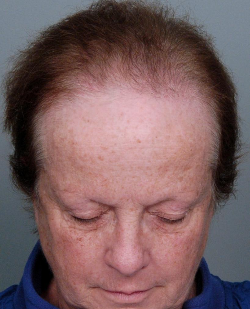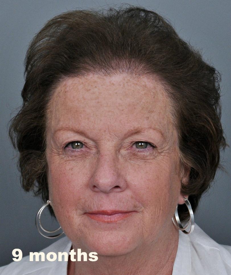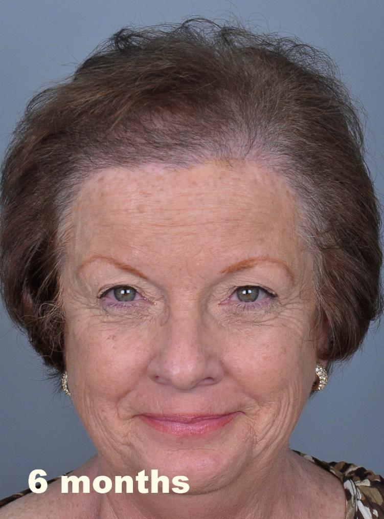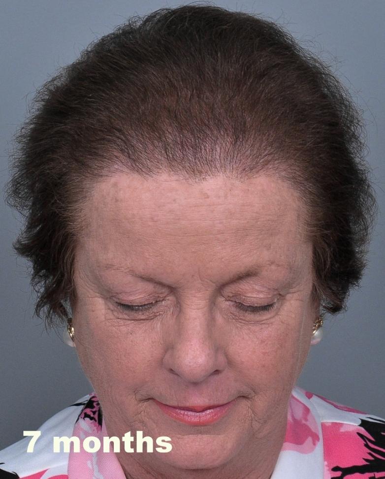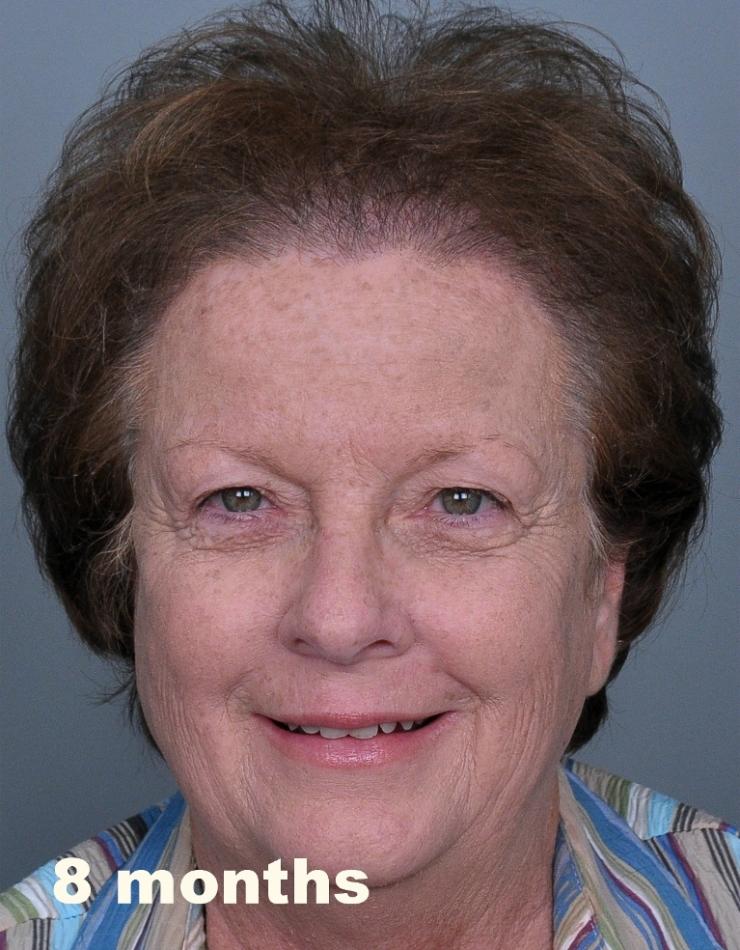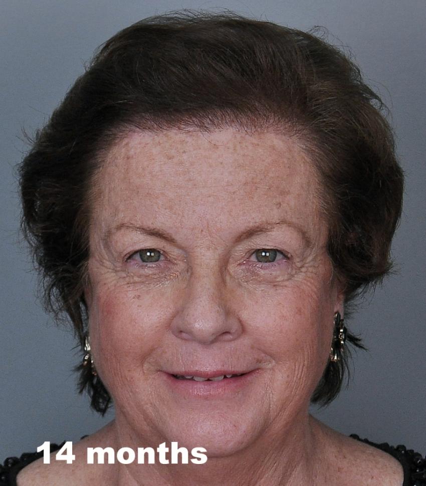 This delightful lady is in her late 60's and came to see me about restoring her hairline. She reported that she always had a high hairline, and showed me childhood photos demonstrating this. But over the last 10 years, her hairline had begun to recede even more from female pattern hair loss. Her donor area was about average for what we see in our female patients, only about 50-60 FUs/cm2, mostly 1s and 2s. We harvested as much as we could get by strip, getting 2,807 FUs ( 1-736, 2-1594, 3- 441, 4-36, total hairs = 5,391). She stopped by the office monthly so we could take photos documenting her progress. Her last visit was at 14 months post op.