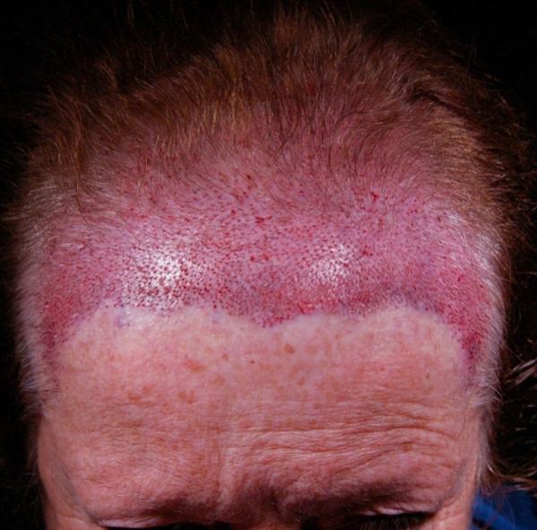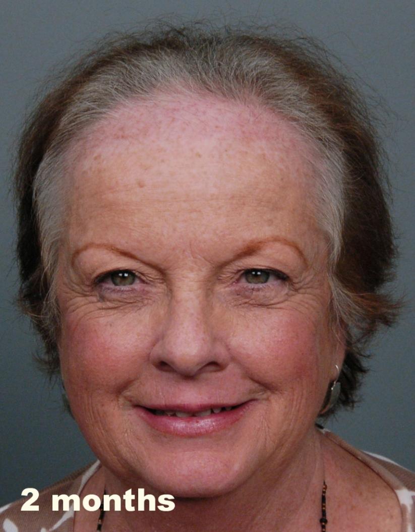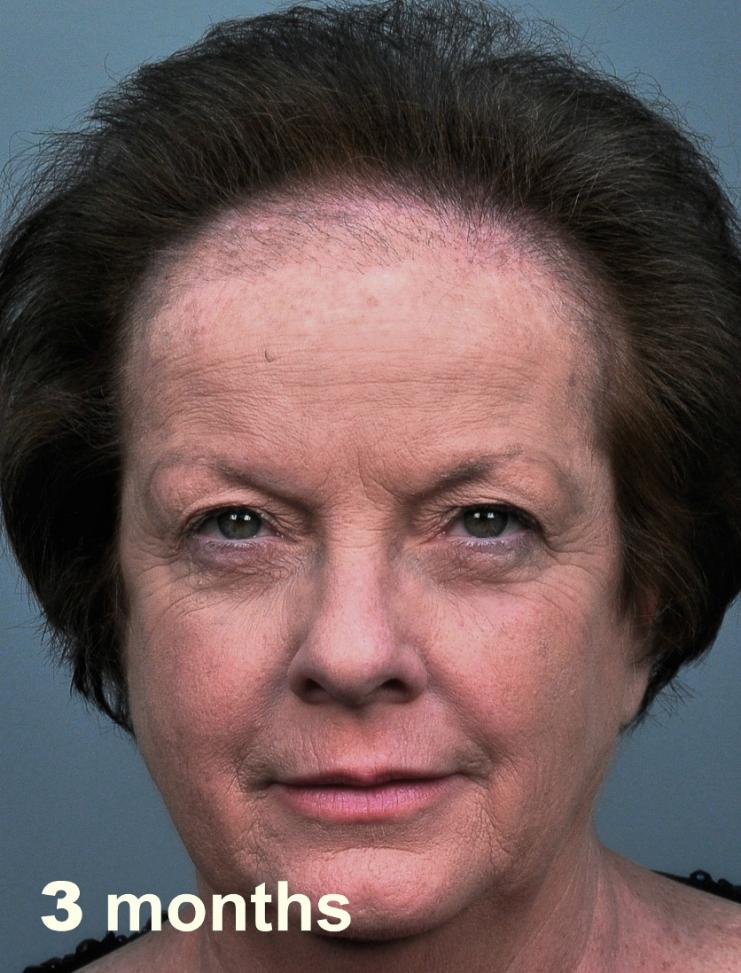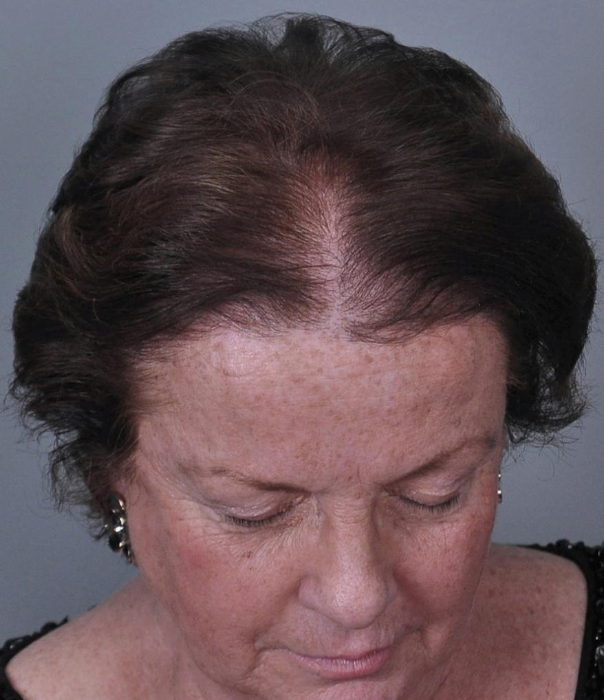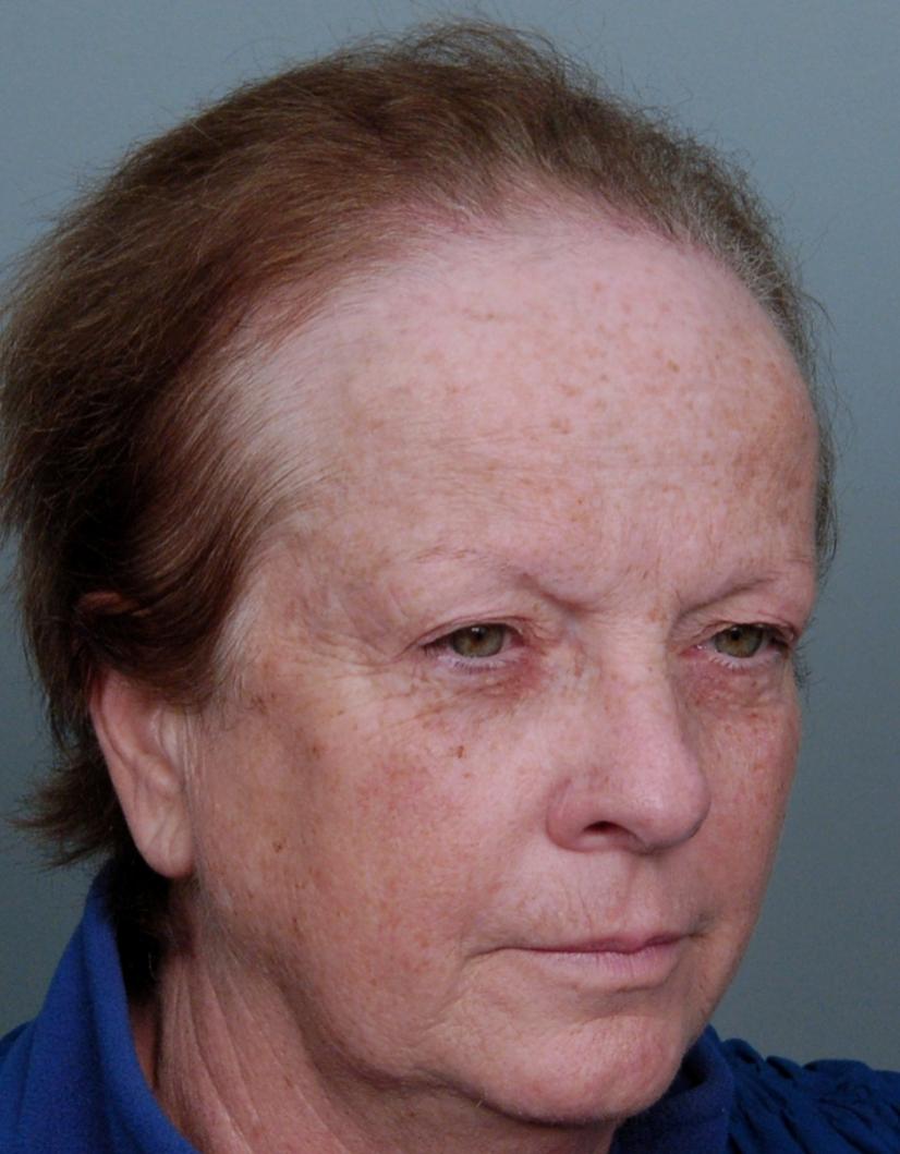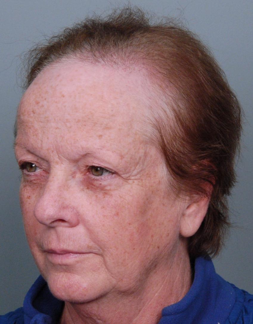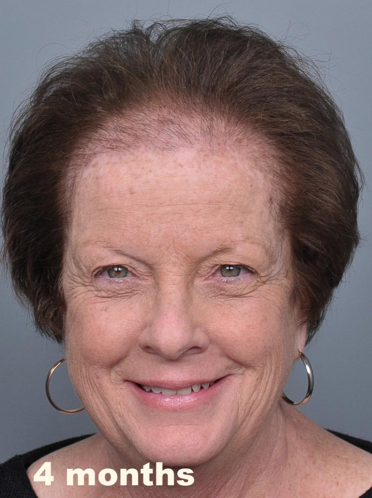 This delightful lady is in her late 60's and came to see me about restoring her hairline. She reported that she always had a high hairline, and showed me childhood photos demonstrating this. But over the last 10 years, her hairline had begun to recede even more from female pattern hair loss. Her donor area was about average for what we see in our female patients, only about 50-60 FUs/cm2, mostly 1s and 2s. We harvested as much as we could get by strip, getting 2,807 FUs ( 1-736, 2-1594, 3- 441, 4-36, total hairs = 5,391). She stopped by the office monthly so we could take photos documenting her progress. Her last visit was at 14 months post op.