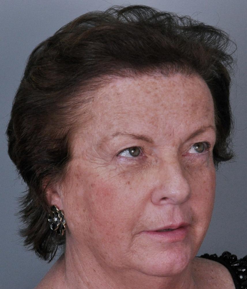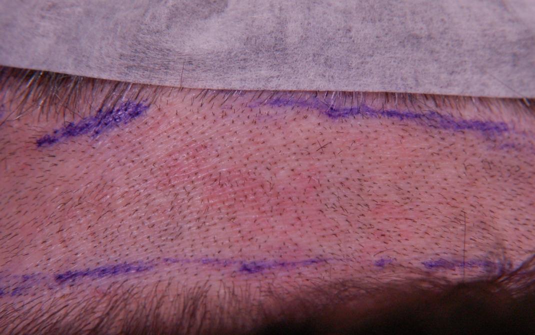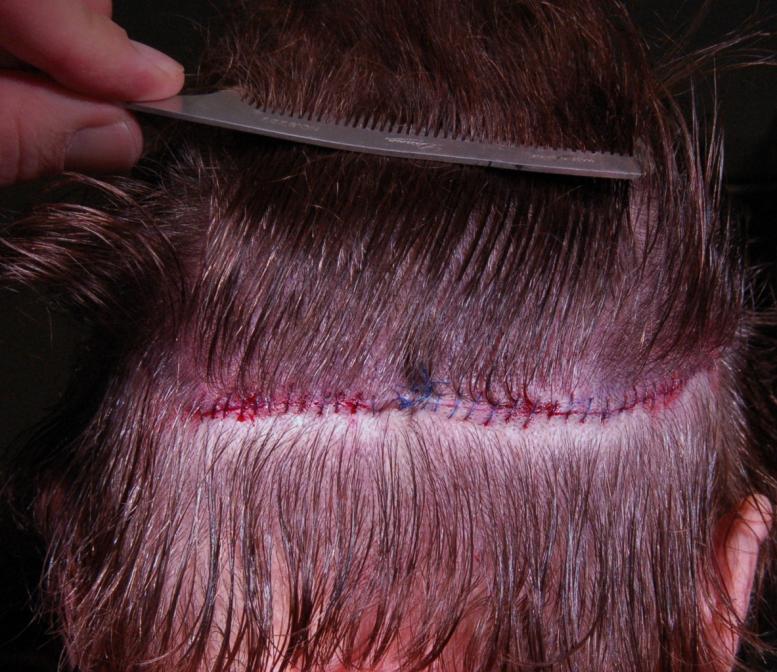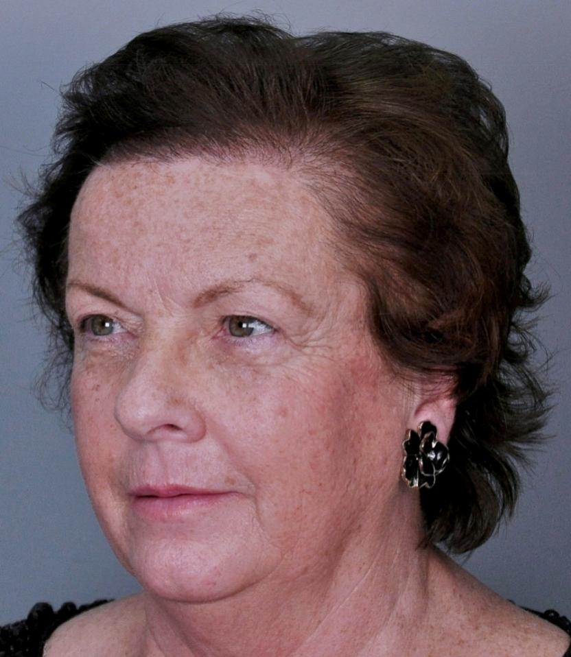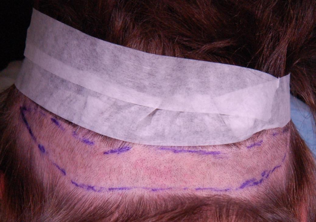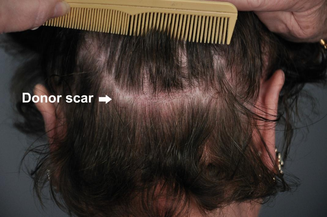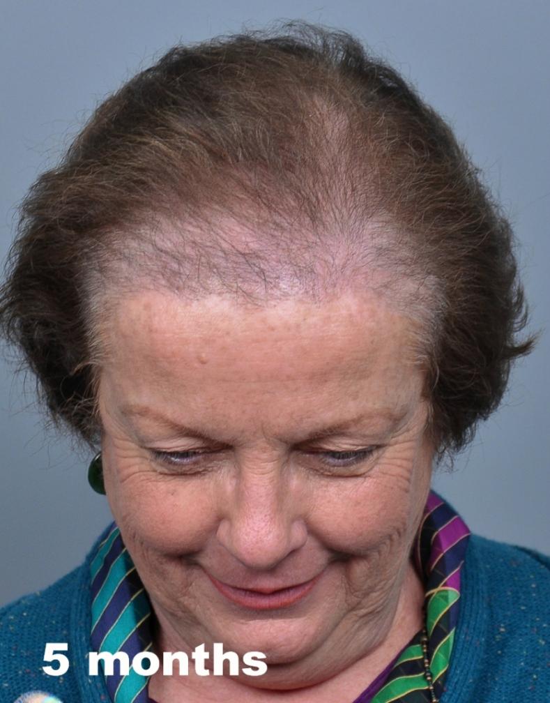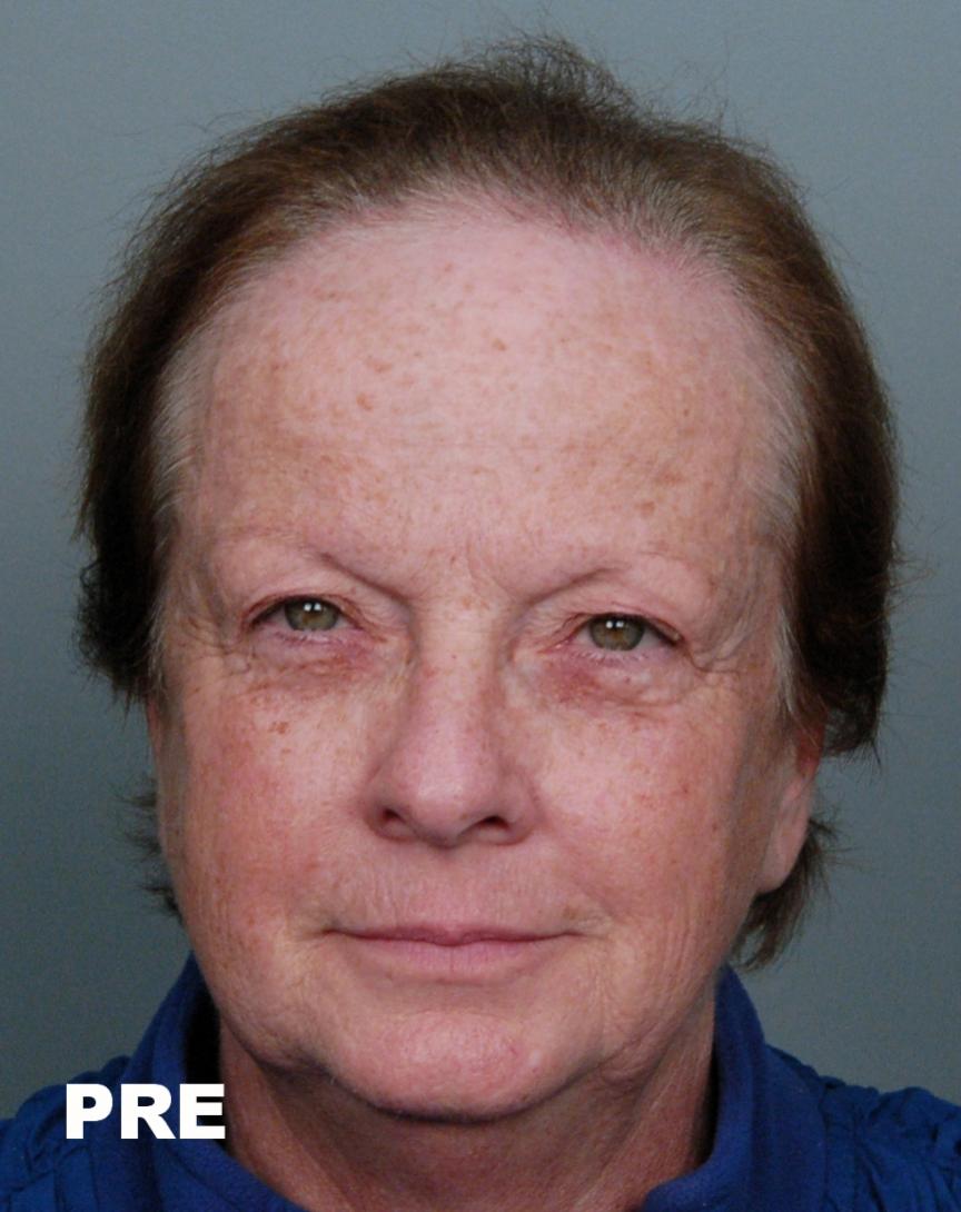 This delightful lady is in her late 60's and came to see me about restoring her hairline. She reported that she always had a high hairline, and showed me childhood photos demonstrating this. But over the last 10 years, her hairline had begun to recede even more from female pattern hair loss. Her donor area was about average for what we see in our female patients, only about 50-60 FUs/cm2, mostly 1s and 2s. We harvested as much as we could get by strip, getting 2,807 FUs ( 1-736, 2-1594, 3- 441, 4-36, total hairs = 5,391). She stopped by the office monthly so we could take photos documenting her progress. Her last visit was at 14 months post op.