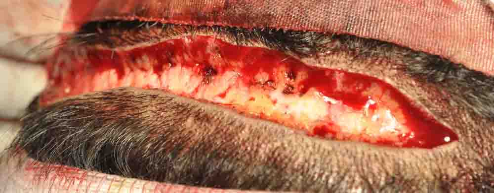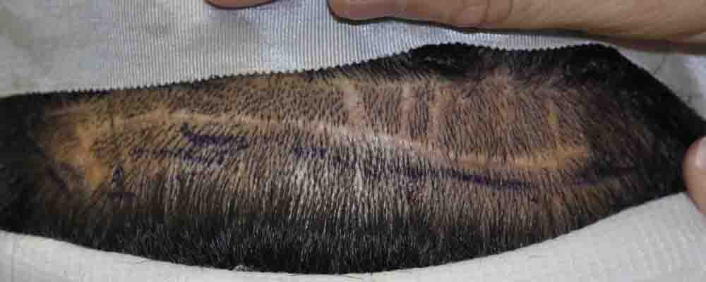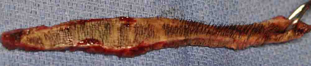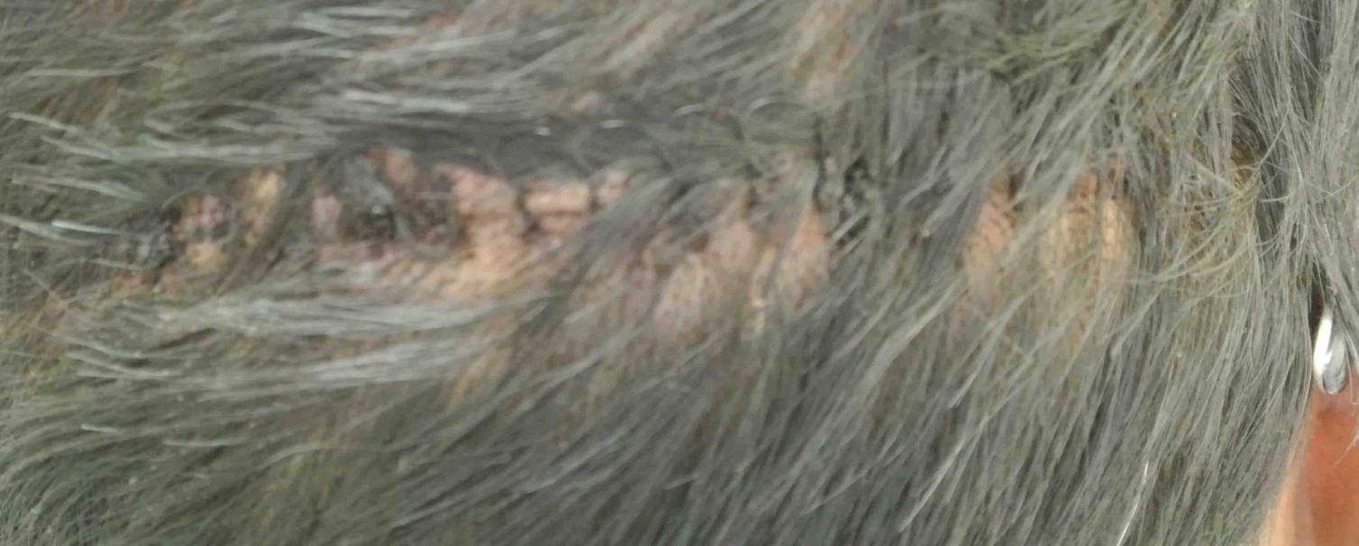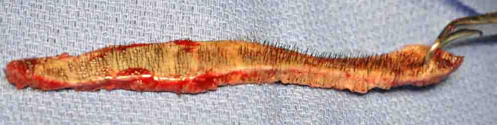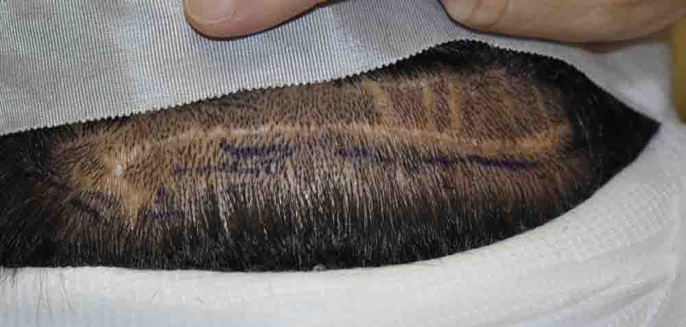 His scar is very unusual. My best guess is that someone took out too big of a strip, and then did multiple Z-plasty incisions to get it closed. Surprising in that his scalp was quite stretchy and closed from my excision with virtually no tension. HOPEFULLY, that will translate into a decent scar.