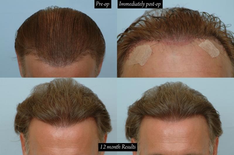 This patient came to our clinic in hopes of obtaining a natural looking hair line. The patient previously had a strip (FUT) procedure that left the hairline very pluggy looking and noticeably mis-angled. A session of plug removal and CIT grafting was performed to successfully treat the case. In the plug removal session, we removed large follicular units (2 to 5 hair), dissected them and placed them back onto the hair line for a softer appearance. Most often patients want us to place these dissected follicular units back onto their donor areas to disguise scarring. The purpose of this session was to remove the large grafts on the hair line. The entire procedure resulted in the redistribution of approximately 170 plugs that yielded approx. 371 grafts for placement back onto his frontal scalp via CIT. At 12 months post-op, you can now see a more natural result after one day of CIT repair.