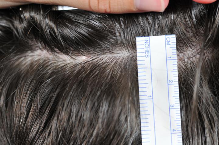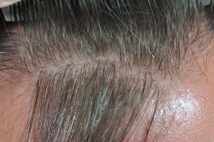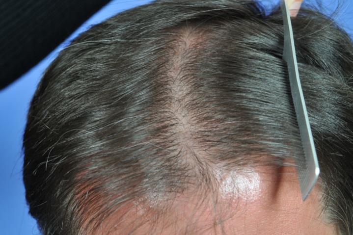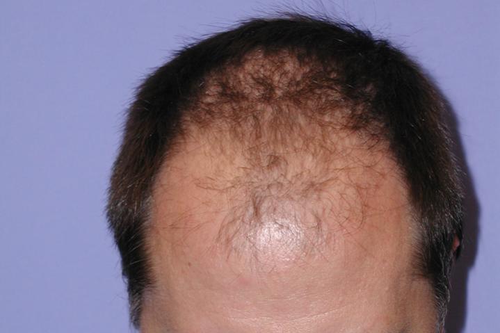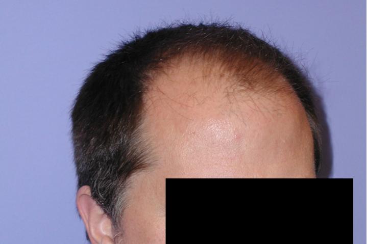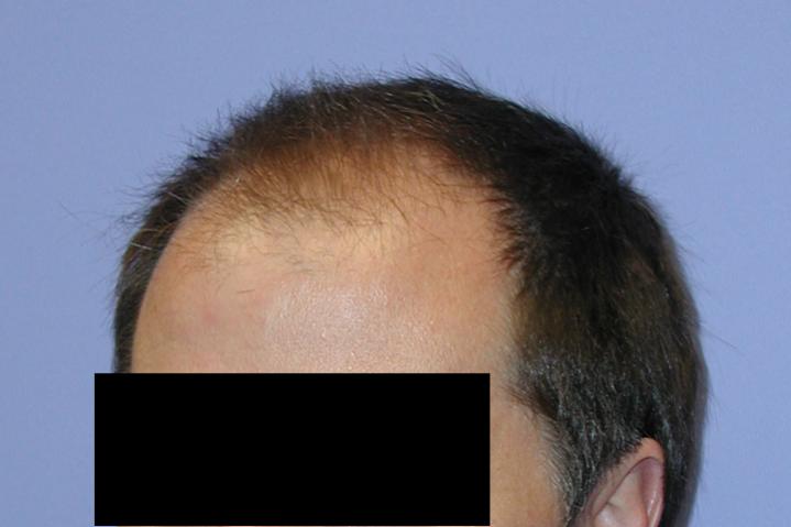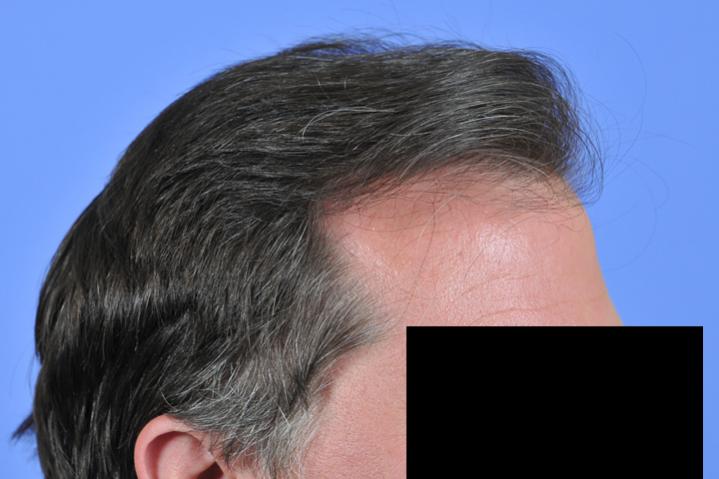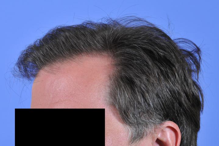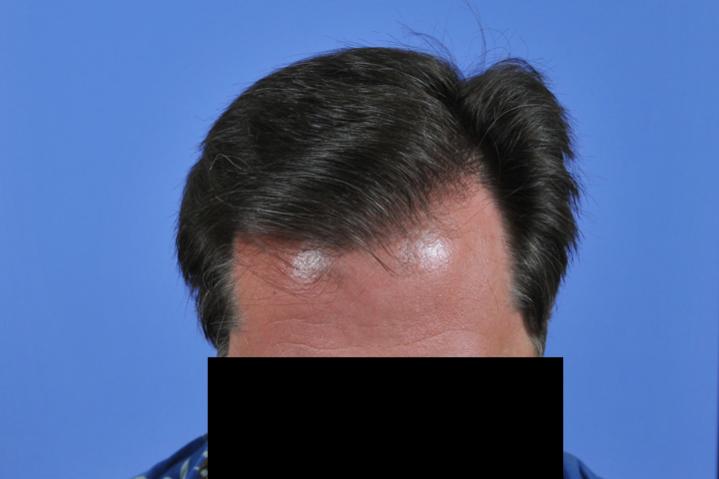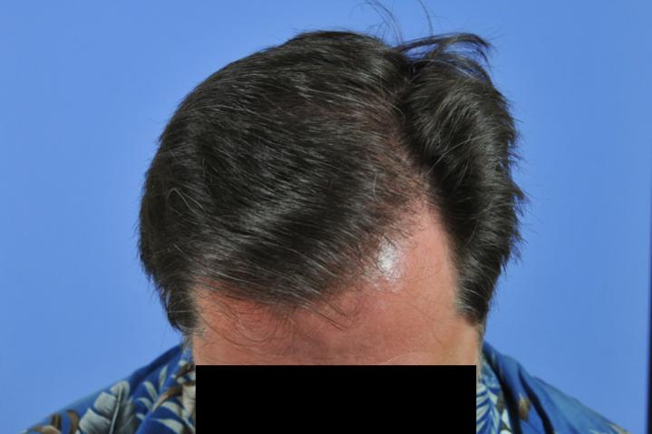 This patient had 2315 grafts placed in the frontal hairline and midscalp 3 years ago. Grafts were placed posterior to several of his native hairs (which have remained) to produce a natural, soft appearing hairline which he desired. He continues to use finasteride on a daily basis which has been working well to maintain the crown.