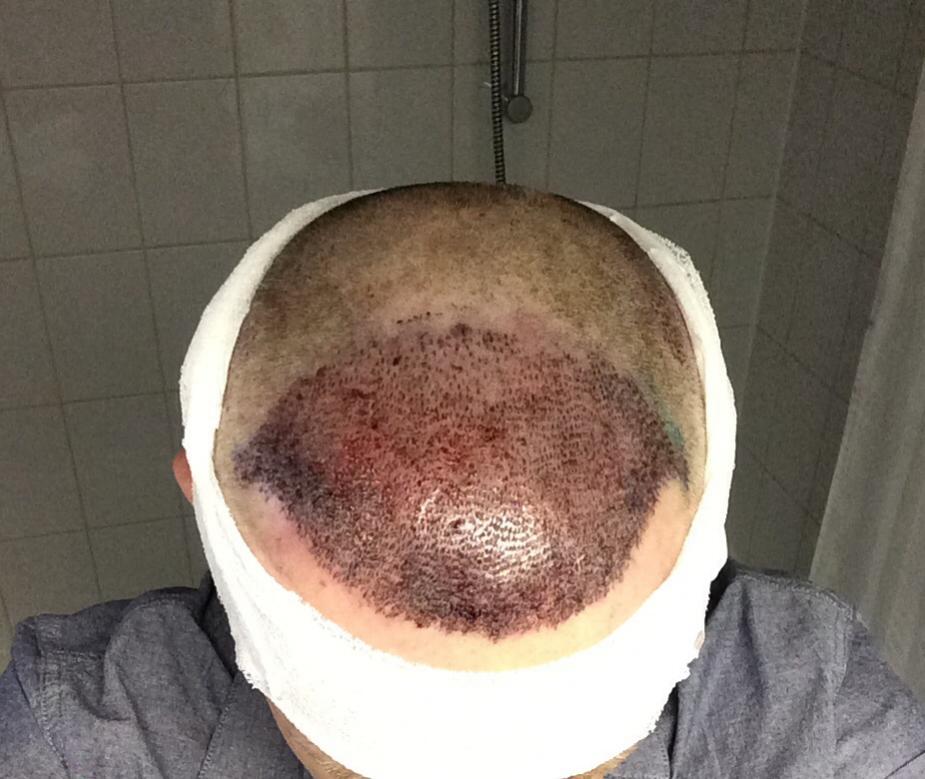 I was surprised but I slept very well the night before the surgery. I got up quite early and had a shower before going down for breakfast. At breakfast, another chap turned up who had clearly had surgery the previous day. That's the good thing about this hotel, no-body bats an eyelid at people walking about with bandages on their head - they are used to it. At around 0830, the taxi came for me and we travelled the 10 minutes or so to the clinic. The taxi driver knew all about the clinic and the staff and re-assured me I was in good hands. I was met by the receptionist and showed to my private room where I removed my clothes and put on crocks and a green surgical gown - all very professional. The clinic is modern and spotless and you get a sense straight away that everyone knows what they're doing, I had to read and sign some forms which were straight forward. When Dr Feriduni arrived, I went into his office and he is extremely good at putting you at ease. We discussed my hairline and what I wanted for around an hour and the Doctor drew the shape of my new hairline onto my scalp. The next step is to have your hair shaved down to a Number one. To be honest I was glad to get rid of the dyed hair. After a hair wash, you go through to the surgery room and meet the staff that are going to perform the procedure. All of them are very nice, friendly and efficient. I had a blood pressure monitor fitted and a saline drip popped in and then waited for a while until they prepared themselves for the surgery. I was watching the blood pressure monitor which was high but I generally felt quite calm. You are then asked to lie on your stomach placing your head through a hole in the middle of the bed so that you can breath and they numb your head at the back and sides which is similar to the injection you get from the dentist. The staff then start to remove the hair follicles one by one. You don't feel anything apart from a bit of blood running down your neck now and then. The hardest part is that you have to stay in the same position flat on your stomach for around 3 hours with nothing to do. It's uncomfortable on mind and body and you just have to find a way in your mind to relax and let the time pass by. I was relieved when it was over and I could sit up normally. I decided to skip lunch and let the staff carry on with the surgery. Dr Feriduni came in and made the 3k incisions that were required for the grafts. This sounds and feels just like prodding holes in a jacket spud with a fork before you pop it in the microwave. The rest of the day was taken up with up to three of the staff working simultaneously to place the grafts in the holes until they have filled all the holes. They then bandage the back of your head to prevent an infection and you are done. At that point I went back to my private room, got dressed and ate my sandwich. All in all, I had been operated on over a period of about 6 hours. I can't speak highly enough of the organisation and execution by Dr Feriduni and his staff. The taxi arrived around 5pm and I thanked everyone and left for the hotel. Arriving back at the hotel, I walked in, the receptionist looked up and said 'good evening' and looked down again. I disappeared upstairs to my room to relax. Here is the picture I took immediately once I got back to the room.