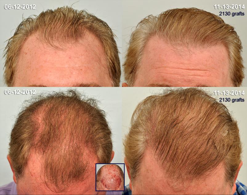 Our patient, who is in his mid forties came to us June of 2012 to address some recession and add some density behind his hairline. He is very pleased with his growth so far. Back today, November 13, 2014, Dr. Cole will place 2.000 more grafts in order to add additional density to his crown. In 2012 he definitely looked balding. Today before his procedure he only appeared slightly thinning. In approximately one year, the 2,000 grafts placed today, should nearly eliminate the impression of a thinning head of hair. His natural hair color works to his advantage because there isn't a lot of contrast between hair and scalp.