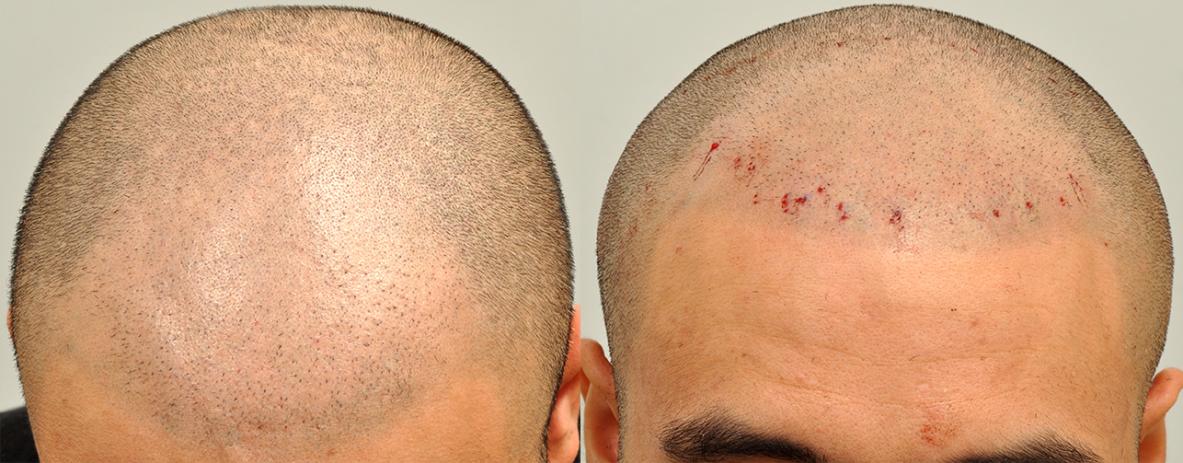 Our second strip scar repair patient pictured on the second row, had around 3,000 grafts placed and got a reasonably good strip scar. Unfortunately according to our patient, his strip procedure graft survival rate was at about 10%. He opted for the shaved look and had a very good result from SMP at his frontal area. Since his strip scar is thin, it didn't take a lot of grafts to fill it in. He should begin to see results at around the 4th. to 6th. month.