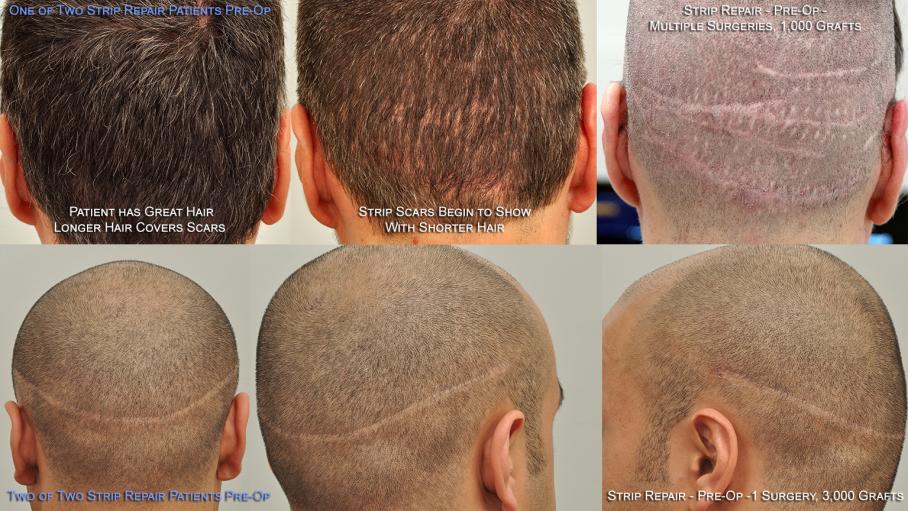 Our strip scar repair patient shown in the top three photos had multiple strip scar procedures at another well-known clinic for a total of 1,000 grafts. He has great hair with the exception of the scarred area on the back and sides of his head. His three photos illustrate how longer good quality donor hair (top left photo) can cover severe scarring. The top middle photo shows how the scars begin to appear with a shorter haircut and his final photo on the top right, reveals the scars with his head shaved down.